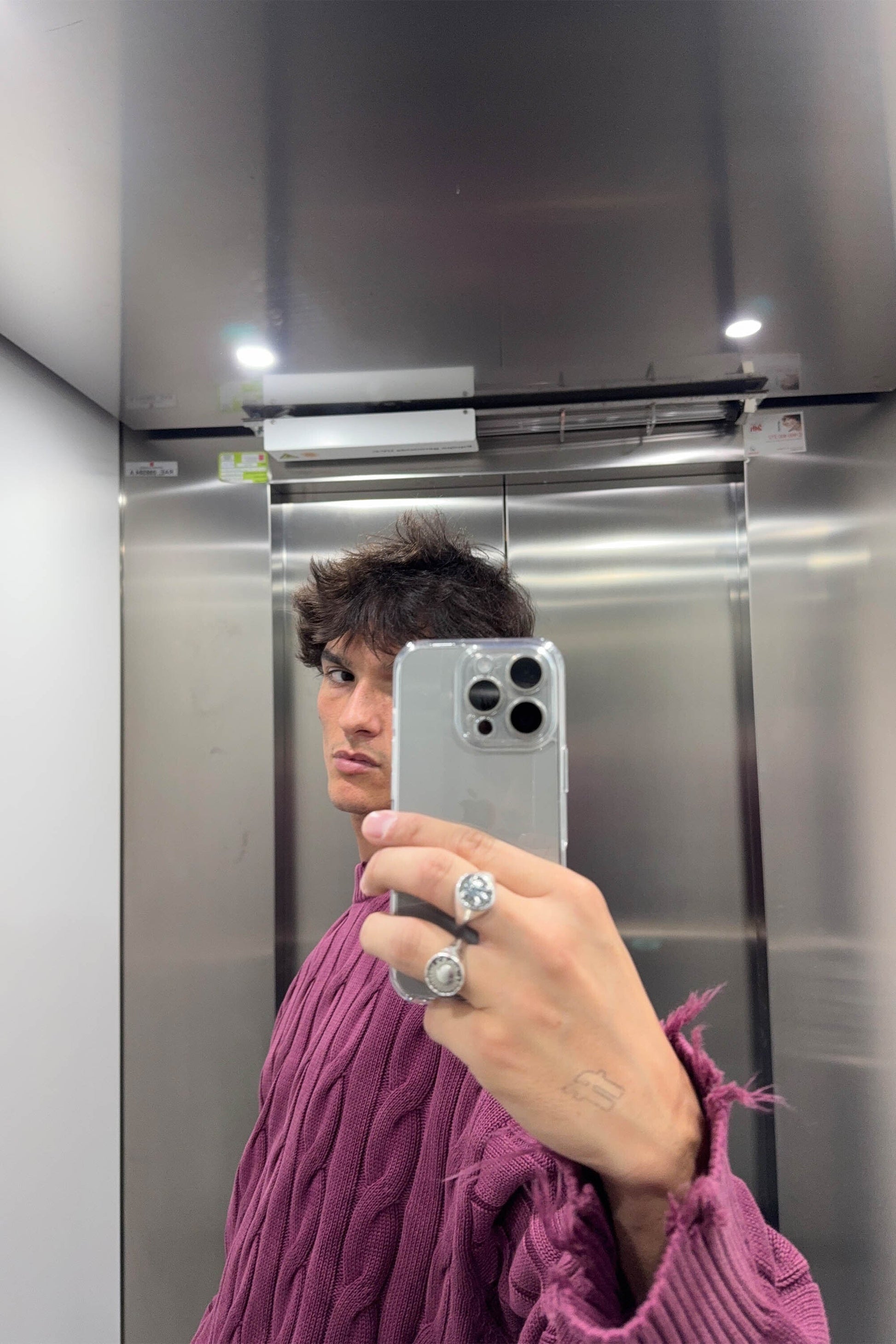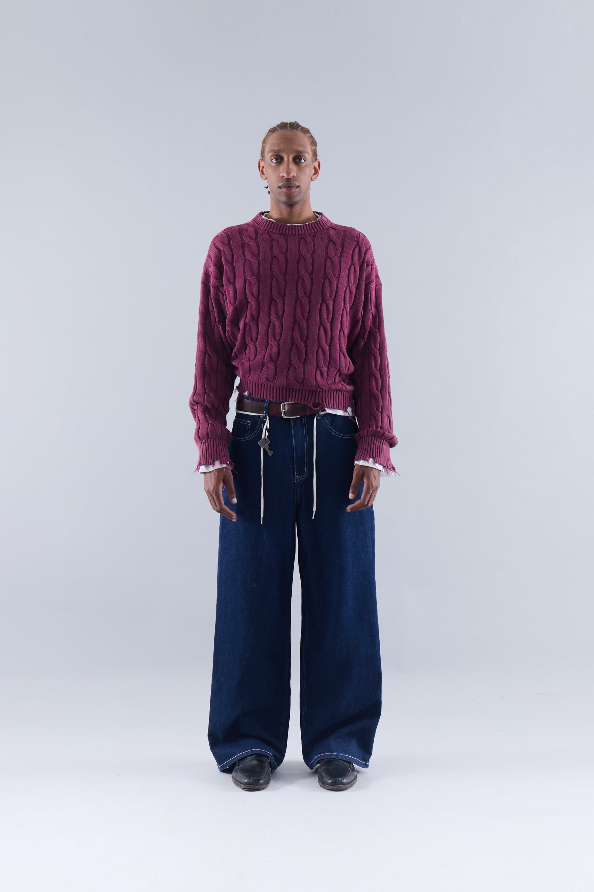 Oversized burgundy cable knit sweater.  'Scuffers Studios' label on the back. Ripped effect details on the sleeves, waistband and collar.