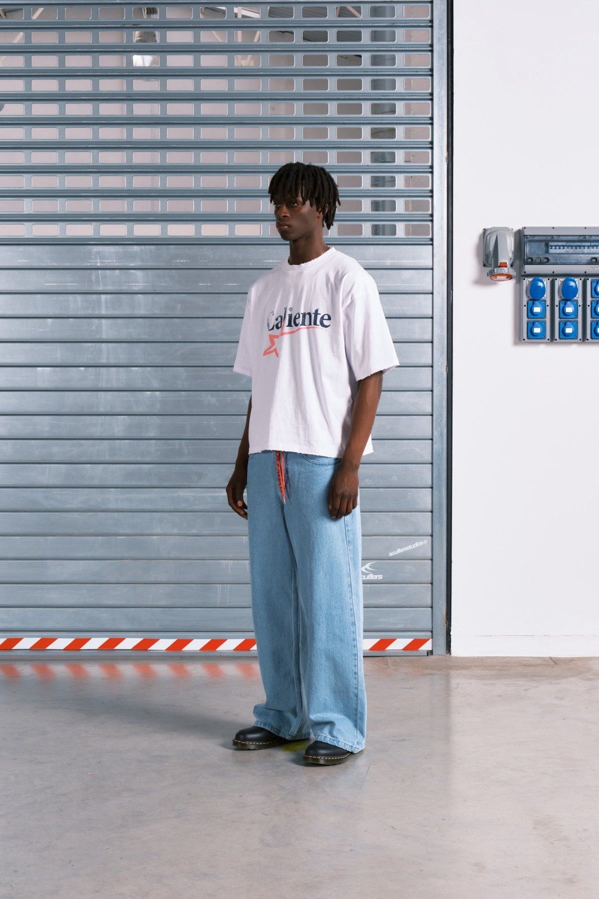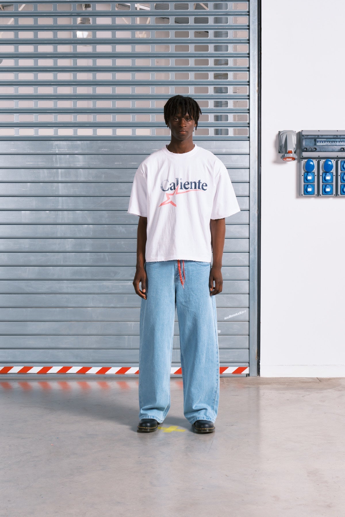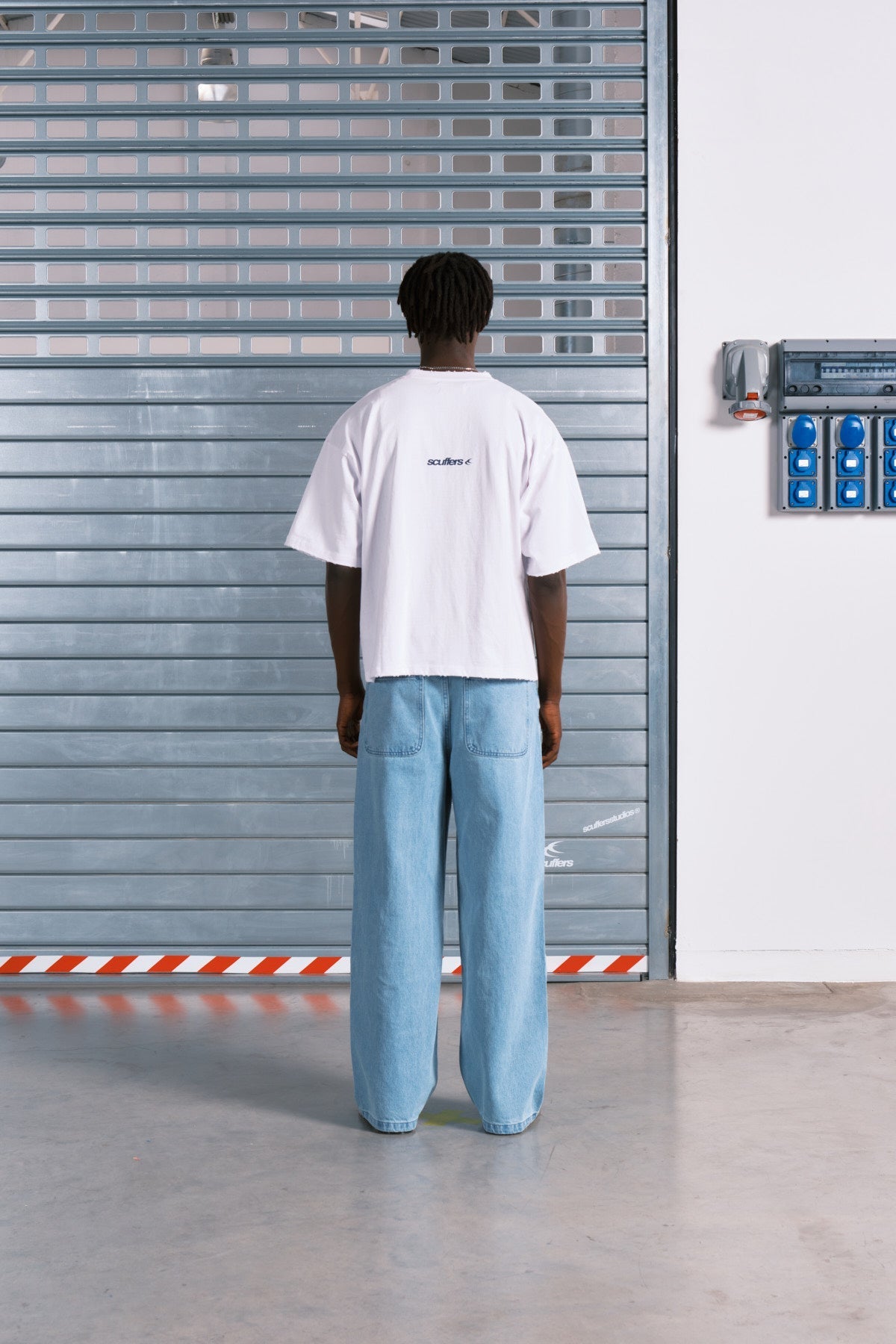 Luźny, biały T-shirt z obniżonymi ramionami. Gwiazda „Grailed” nadrukowana na piersi w jasnoróżowym kolorze z efektem sprania. Z tyłu nadrukowane logo „Scuffers” i nasze podwójne logo z księżycem. Efekt przetarć na ściągaczach przy szyi, rękawach i w pasie.