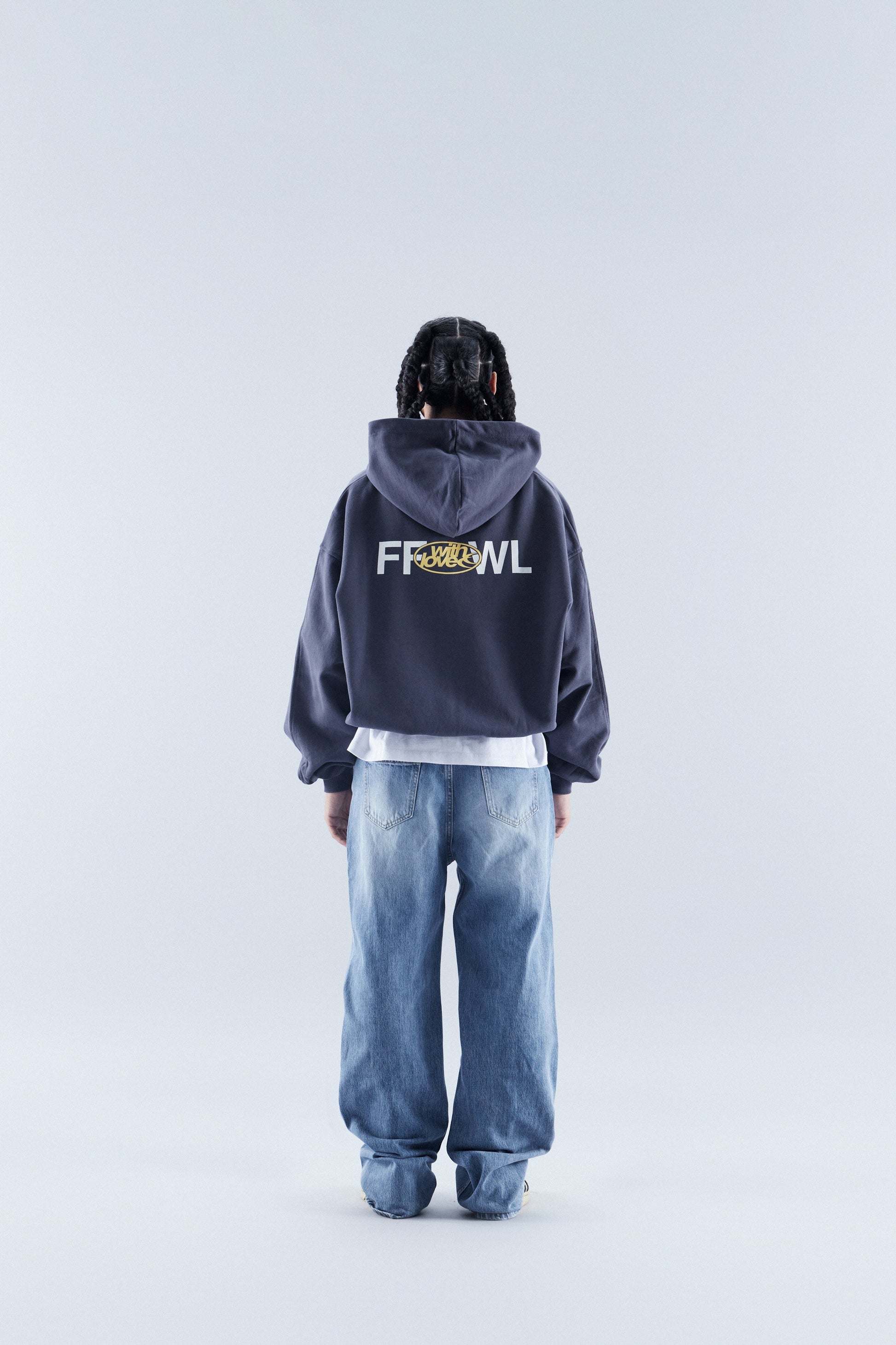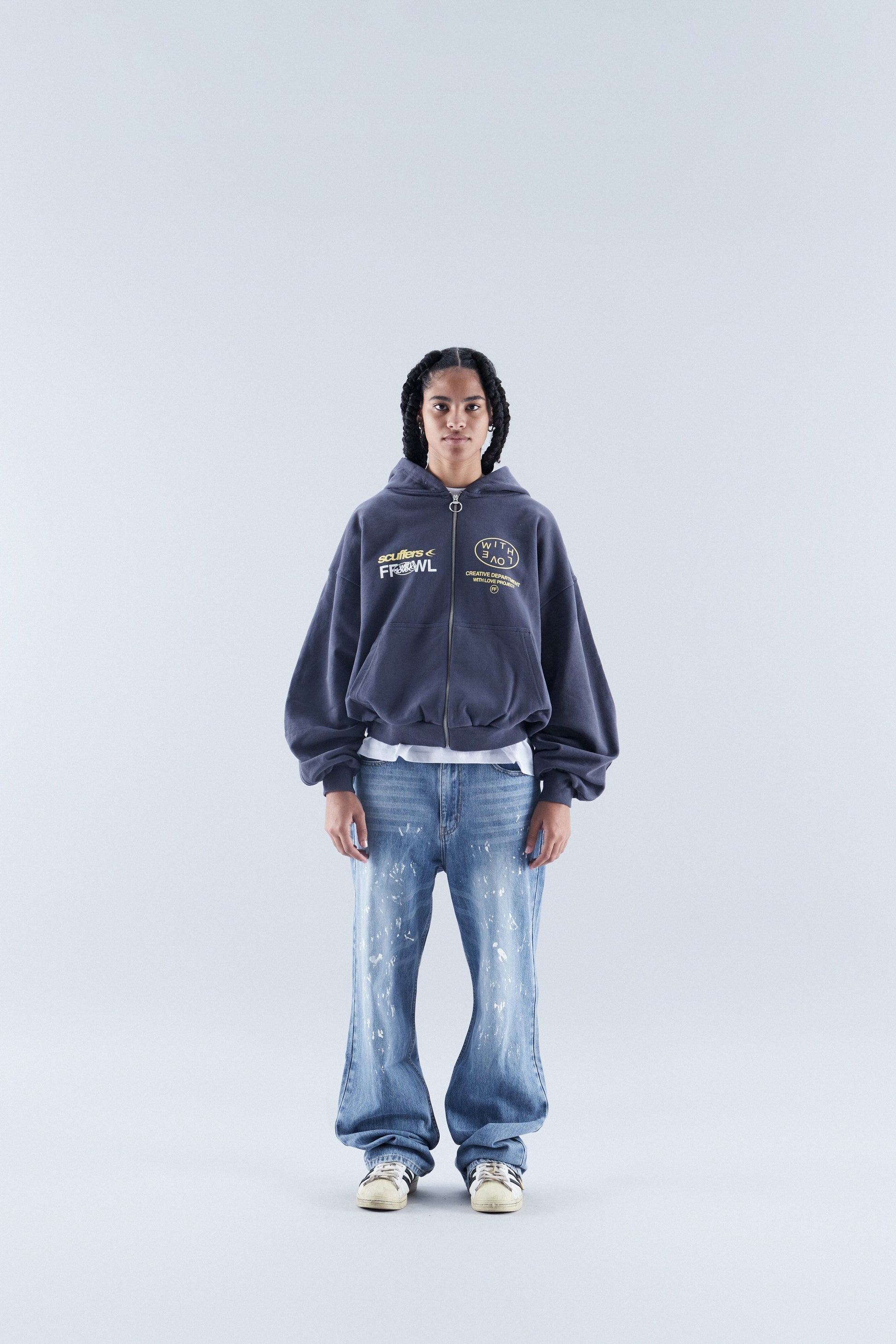 Granatowa, luźna bluza z kapturem i zamkiem błyskawicznym, o luźnym kroju. Logo i wzory sitodrukowe w kolorze żółtym i białym.