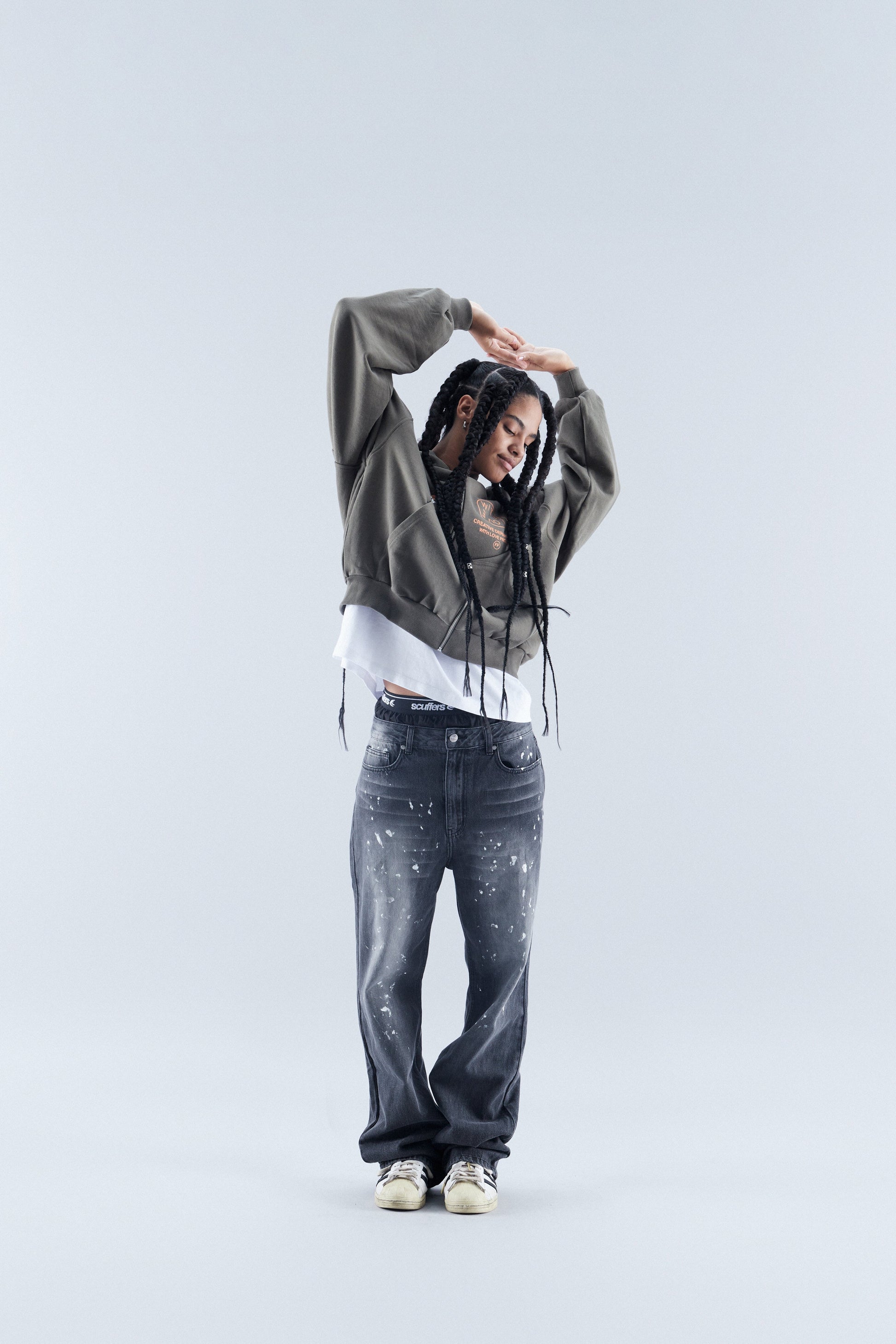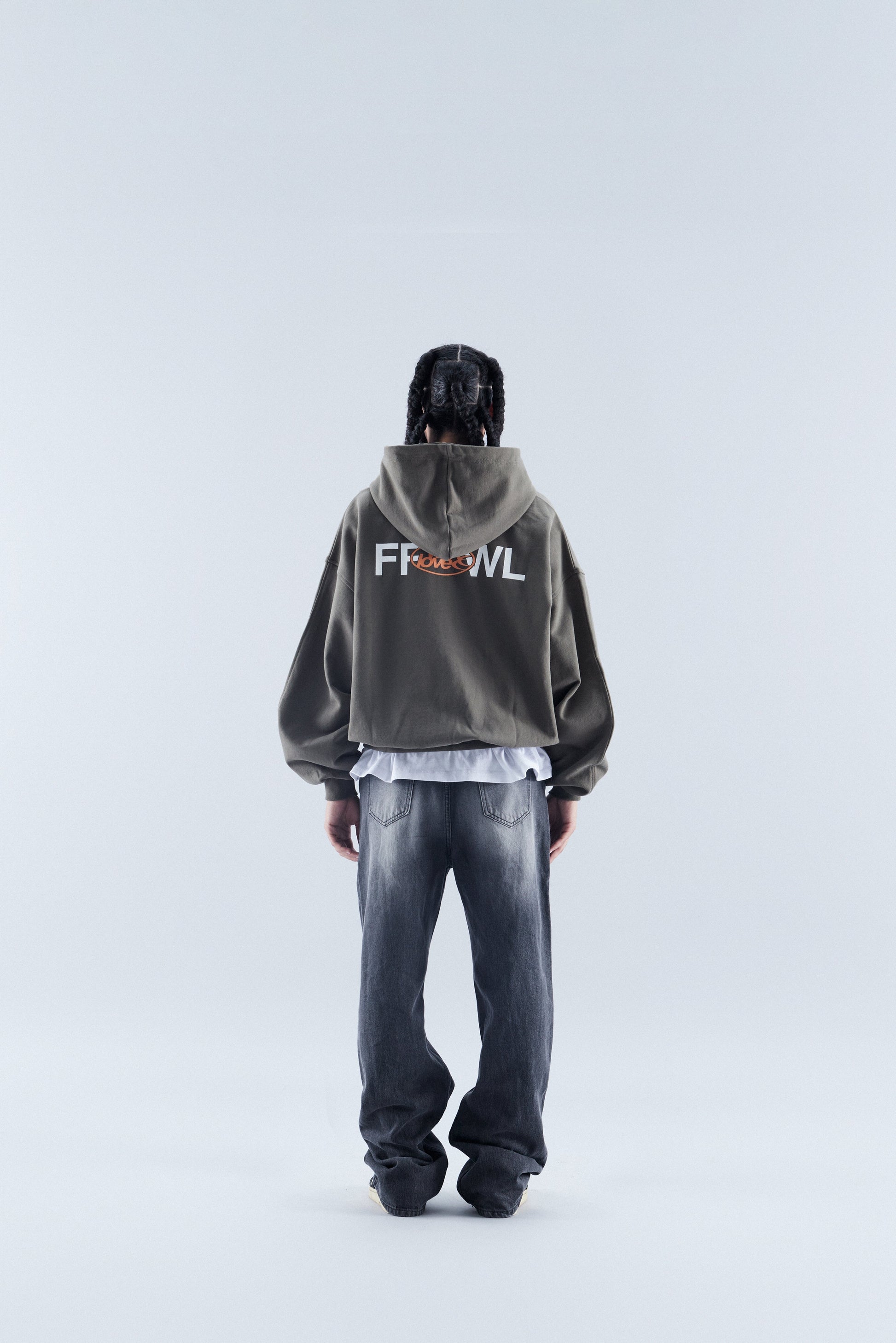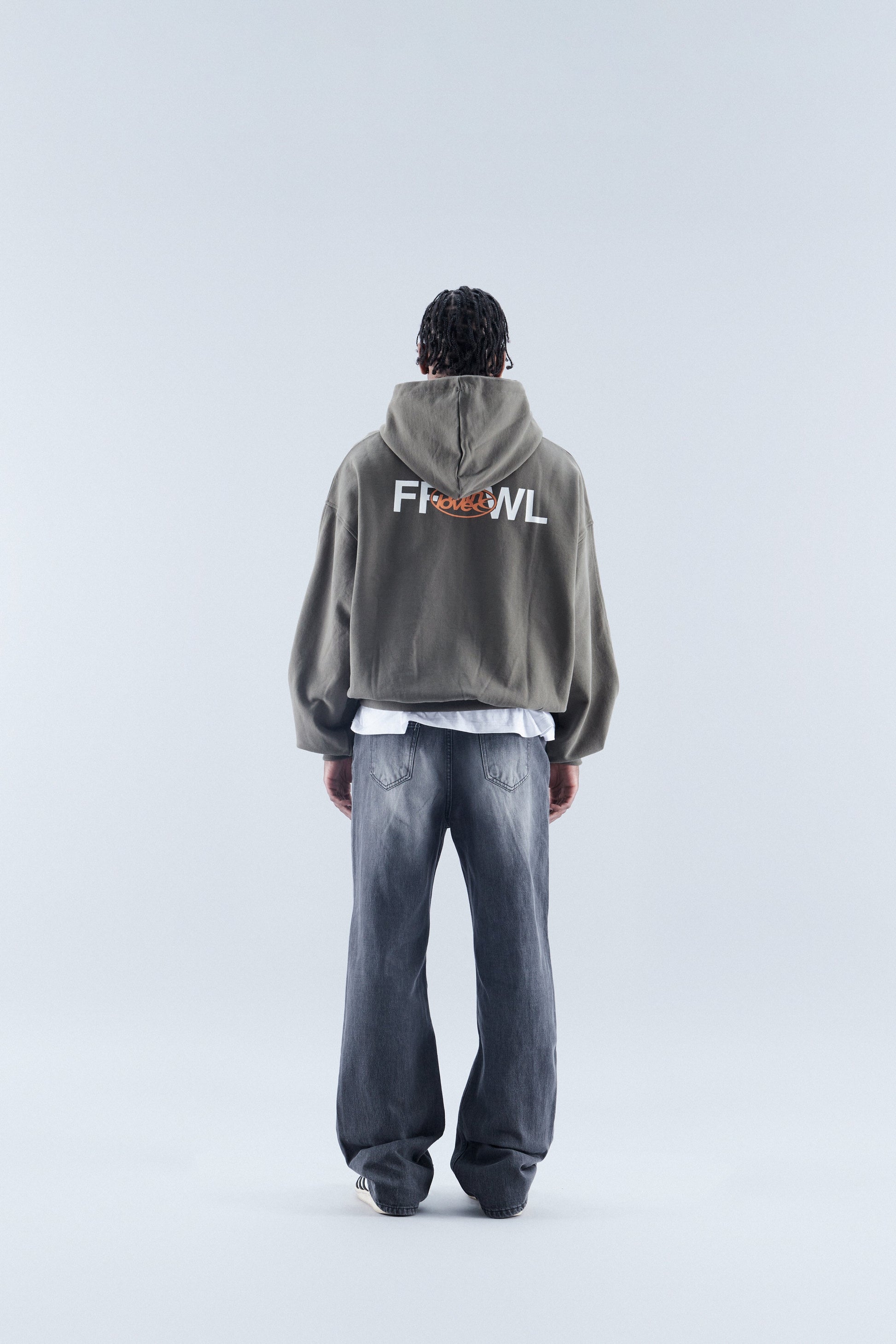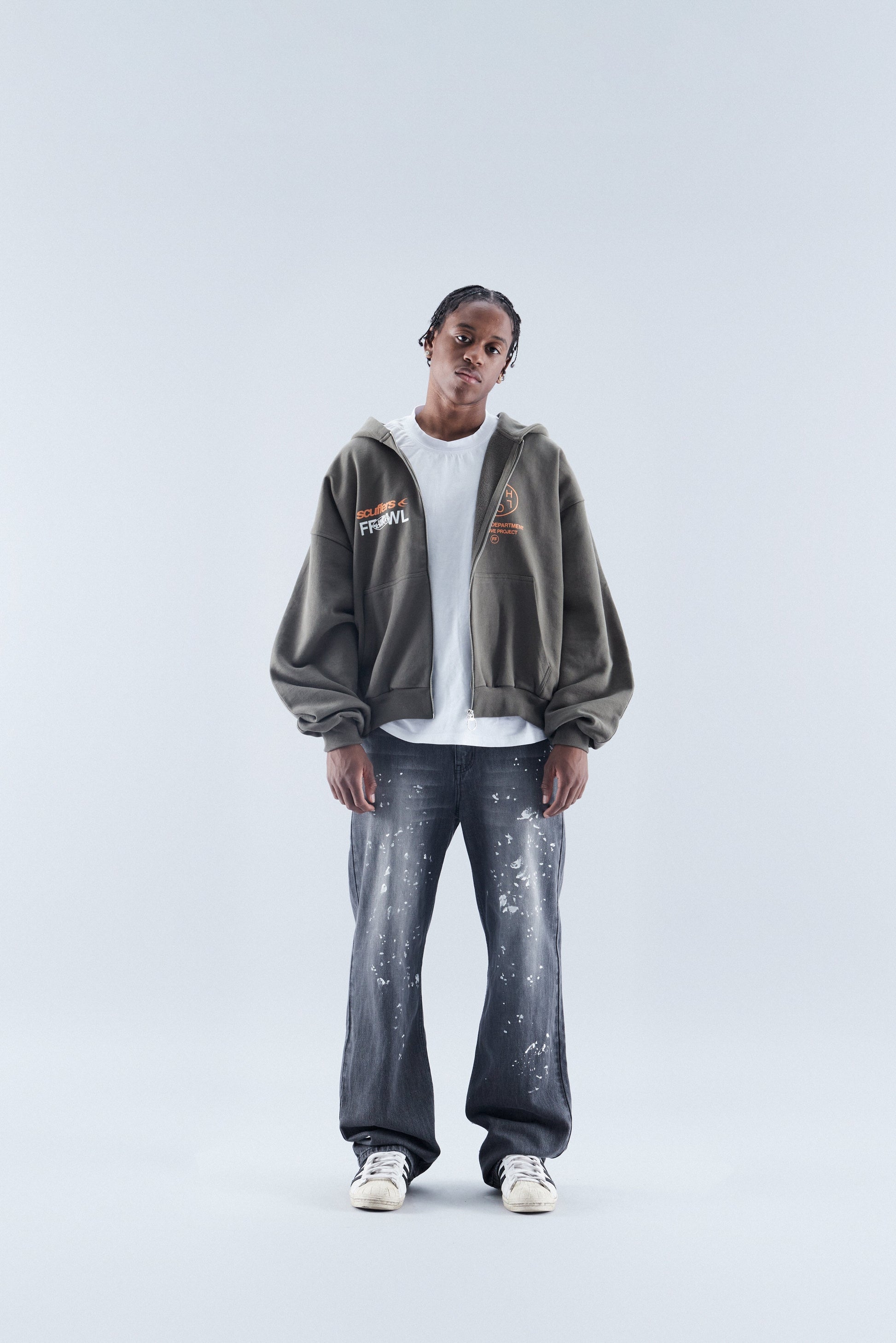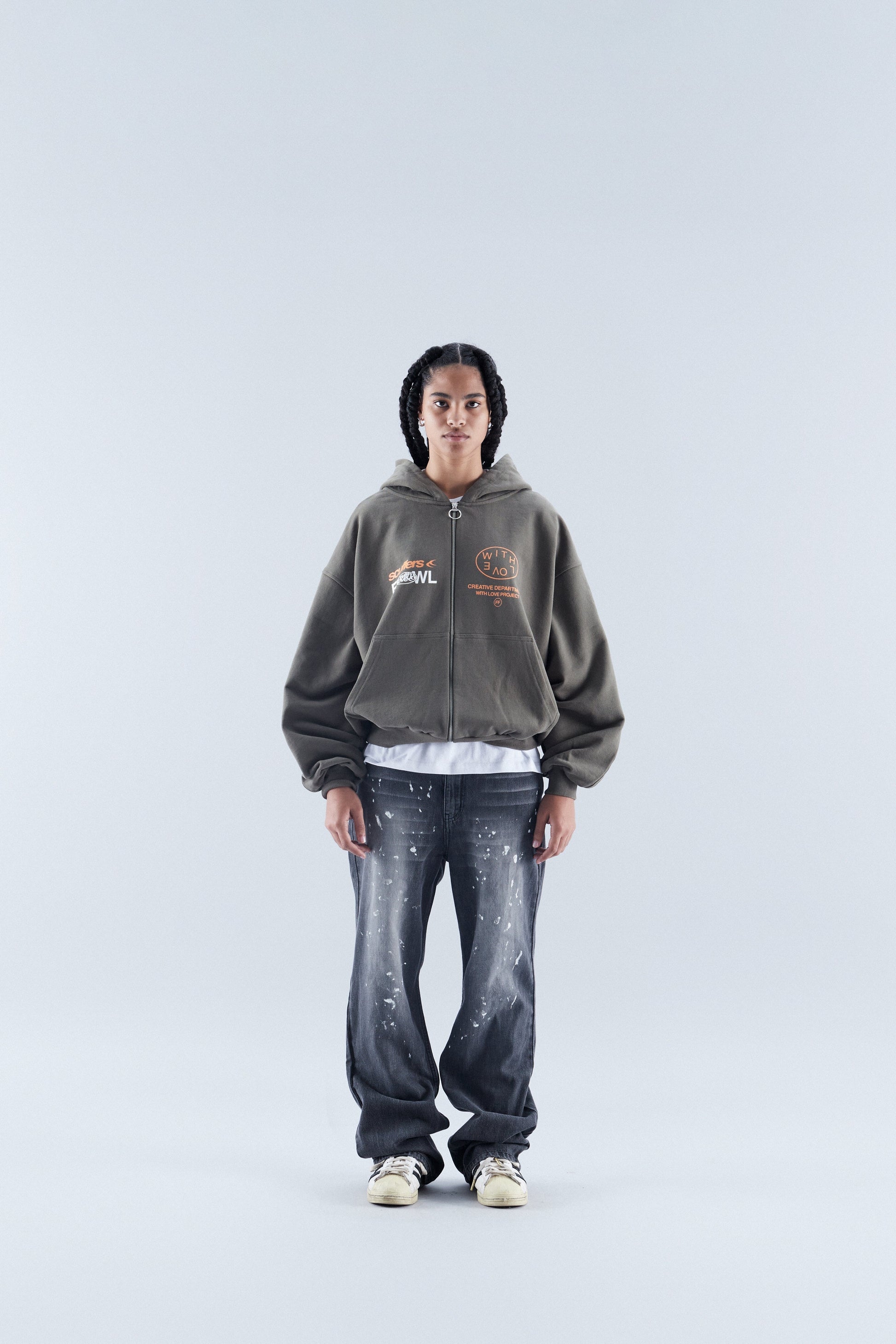 Oliwkowozielona, luźna bluza z kapturem i zamkiem błyskawicznym, o luźnym kroju. Logo i wzory sitodrukowe w kolorze pomarańczowym i białym.