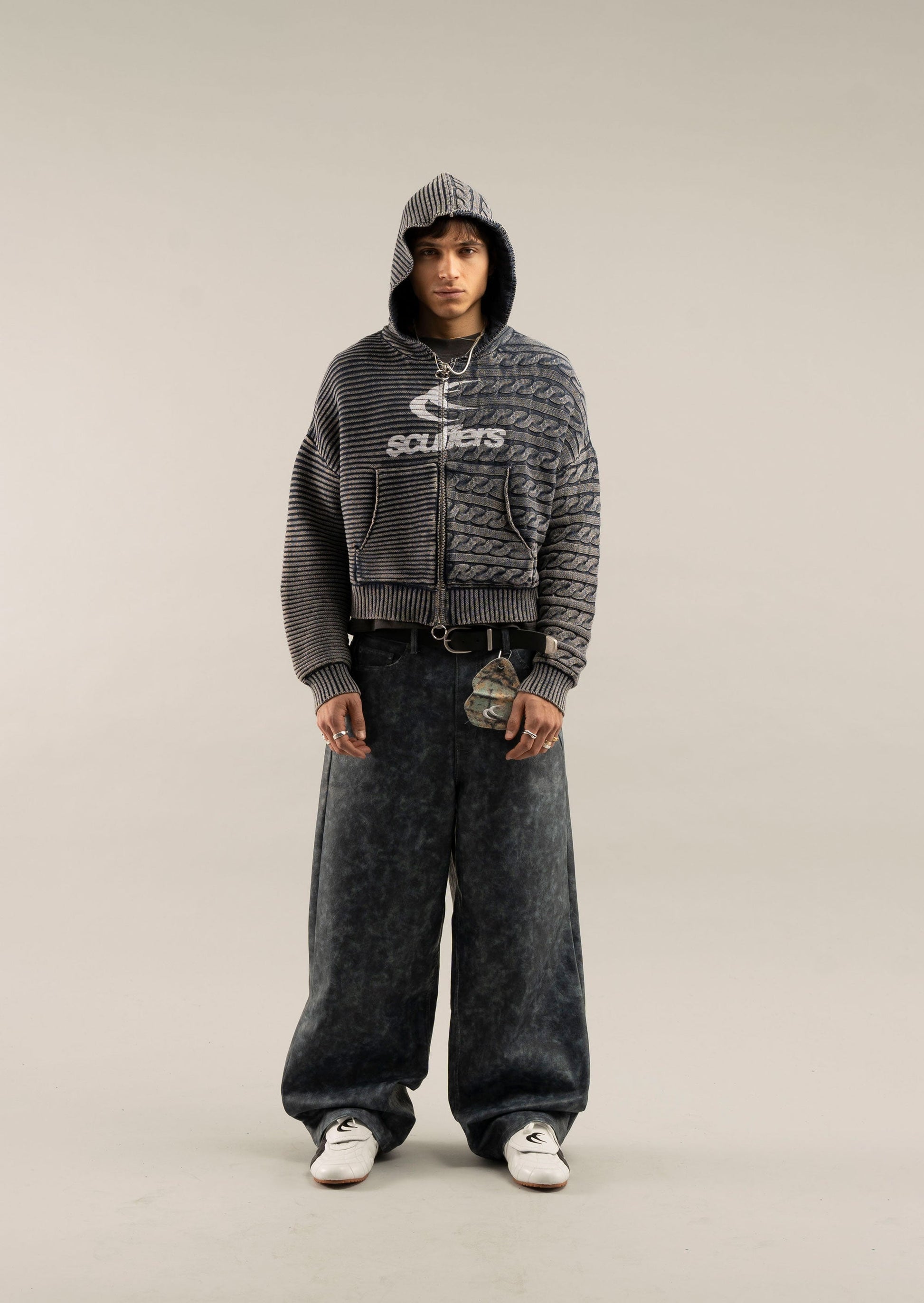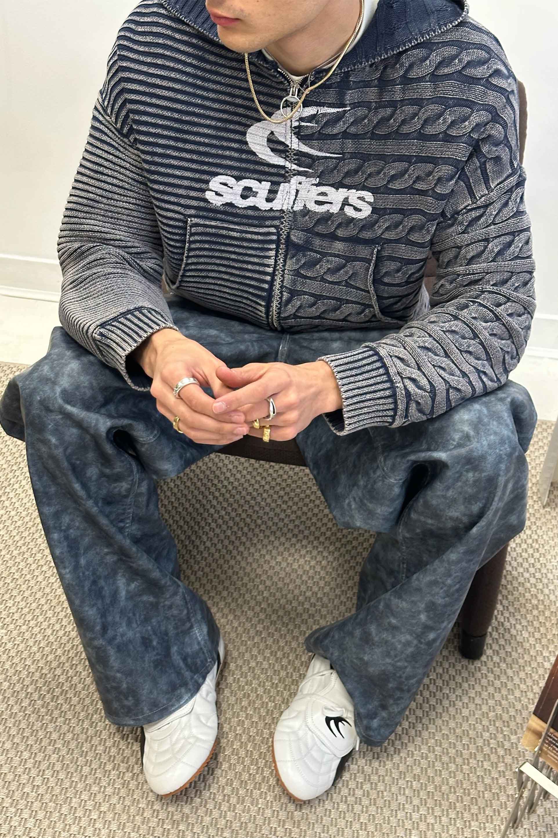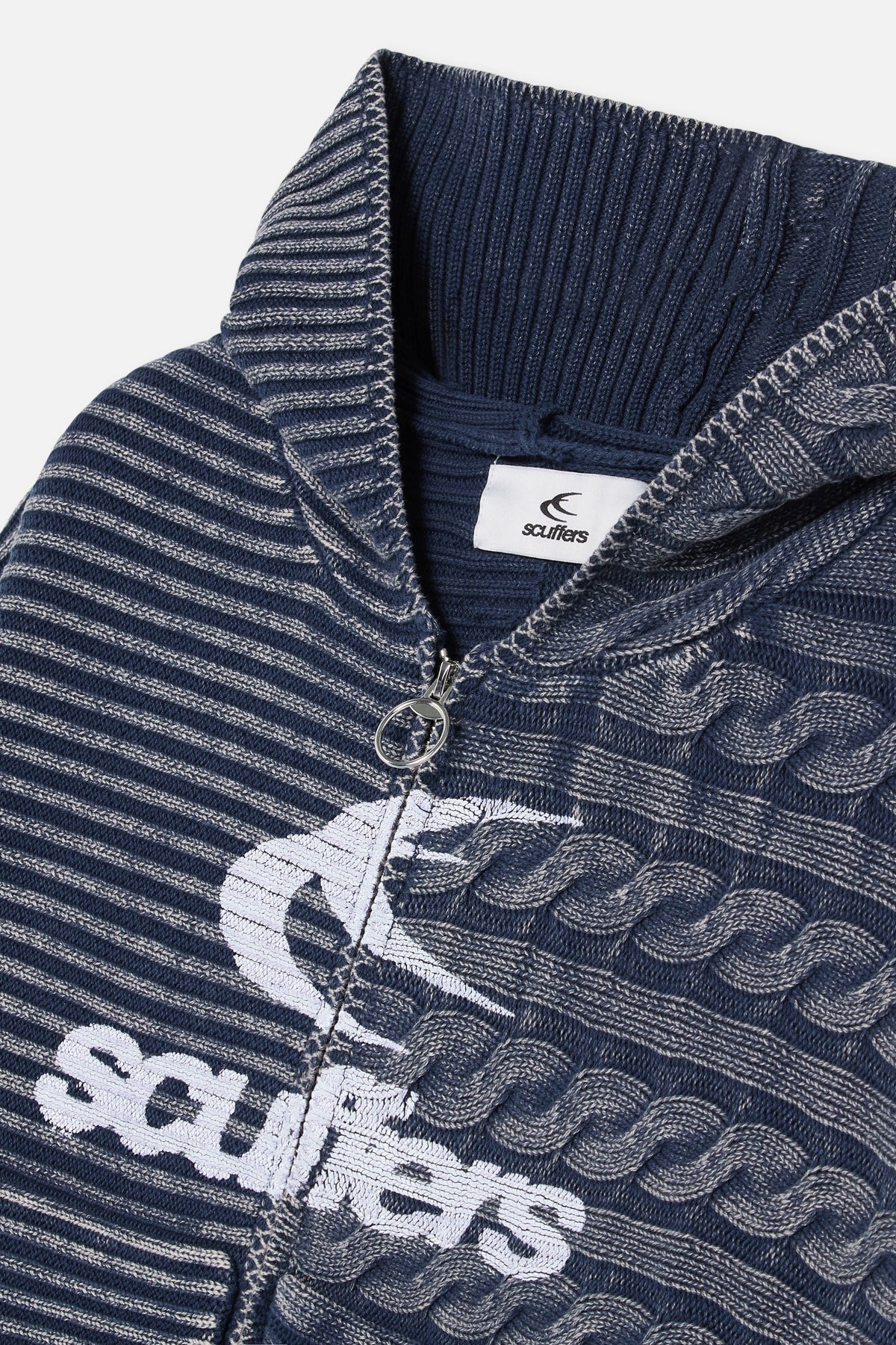 Teksturowana, zapinana na suwak dzianina w kolorze granatowym z wypukłym splotem warkoczowym i ściągaczami. Z białym logo Scuffers z przodu, zamkiem błyskawicznym na całej długości z kółkiem i luźnym kapturem. Z przodu kieszenie kangurki oraz ściągacze przy mankietach i u dołu dla idealnego dopasowania. Wykonana z miękkiej dzianiny zapewniającej ciepło i wygodę.