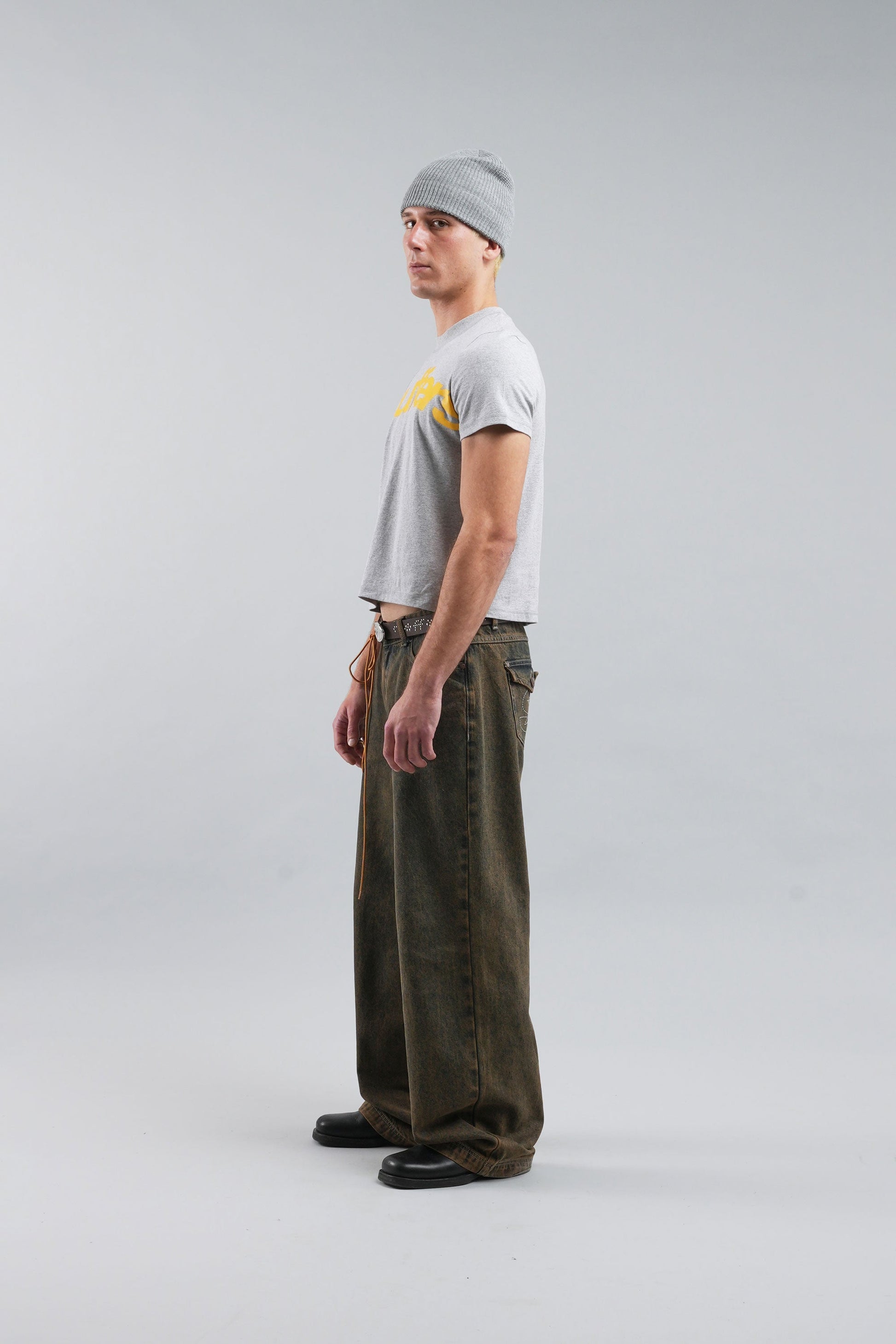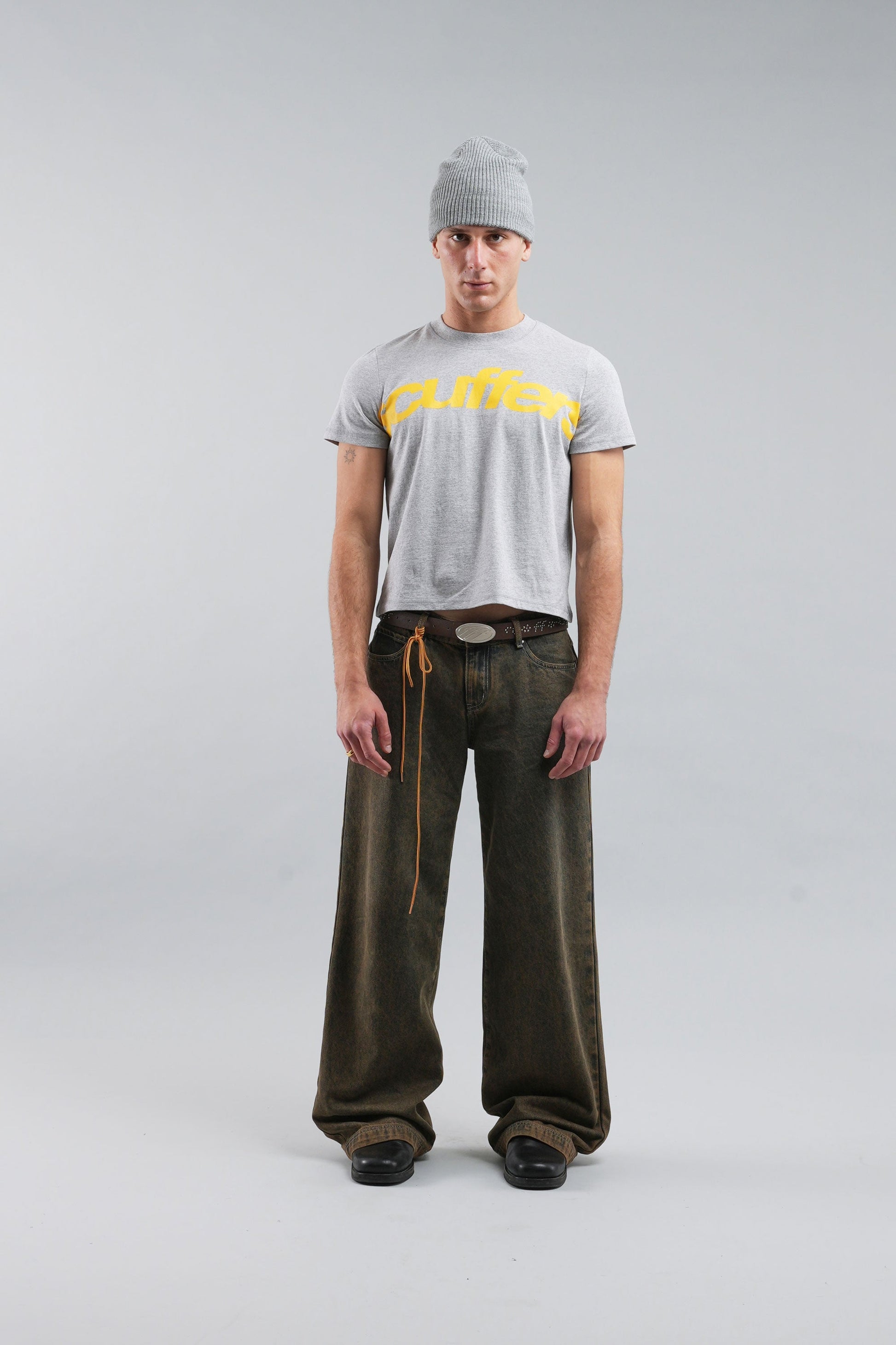 Koszulka z nadrukiem w kolorze melanżowej szarości, wykonana z miękkiej, oddychającej bawełny, zapewniającej wygodę na co dzień. Z wyrazistym, żółtym logo z przodu i subtelnym detalem marki z tyłu. Klasyczny, okrągły dekolt, krótkie rękawy i regularny krój zapewniają ponadczasowy, uniwersalny wygląd.