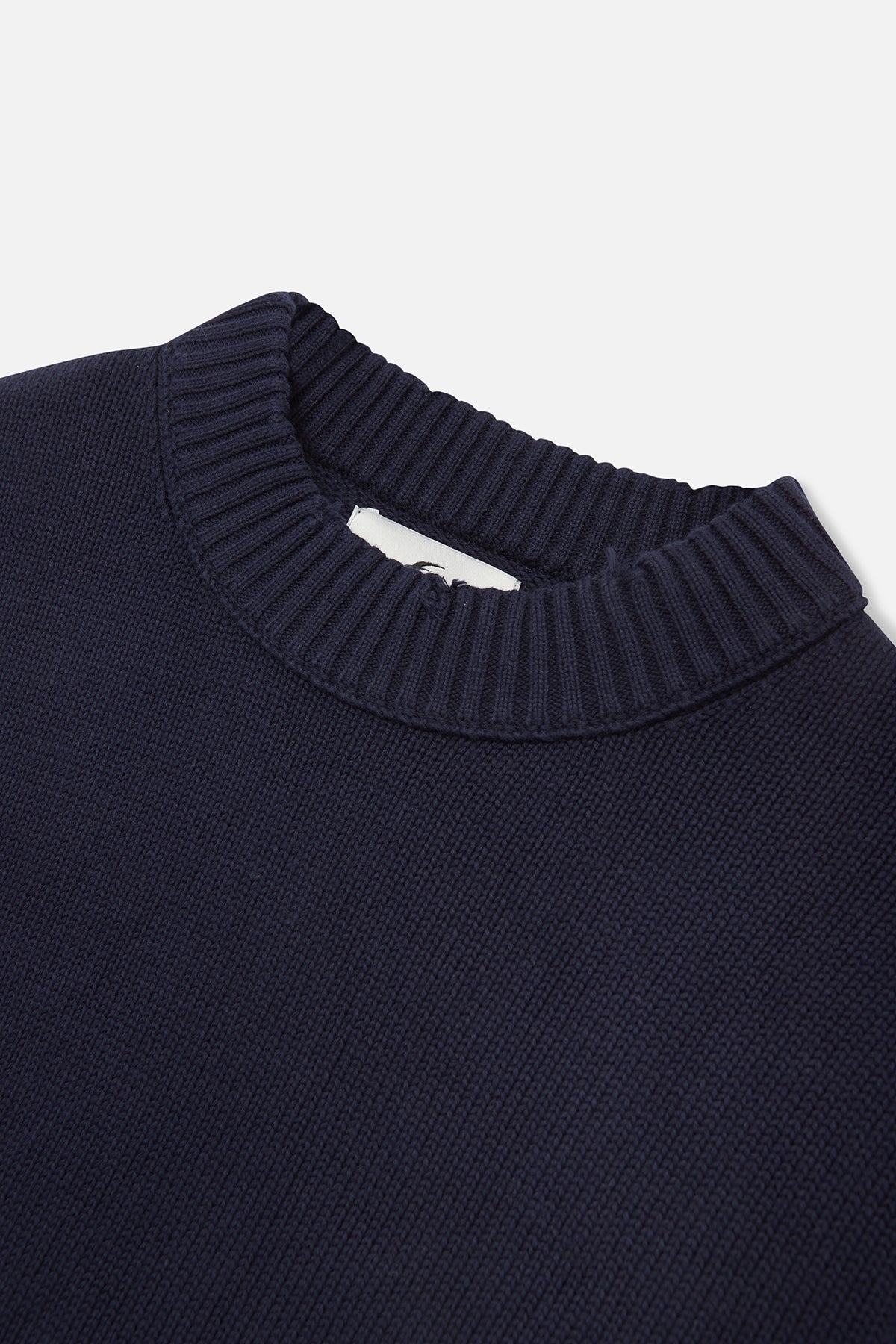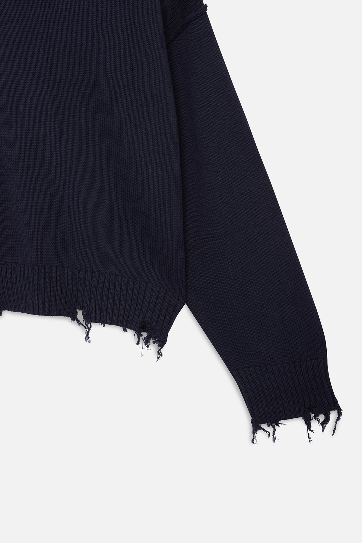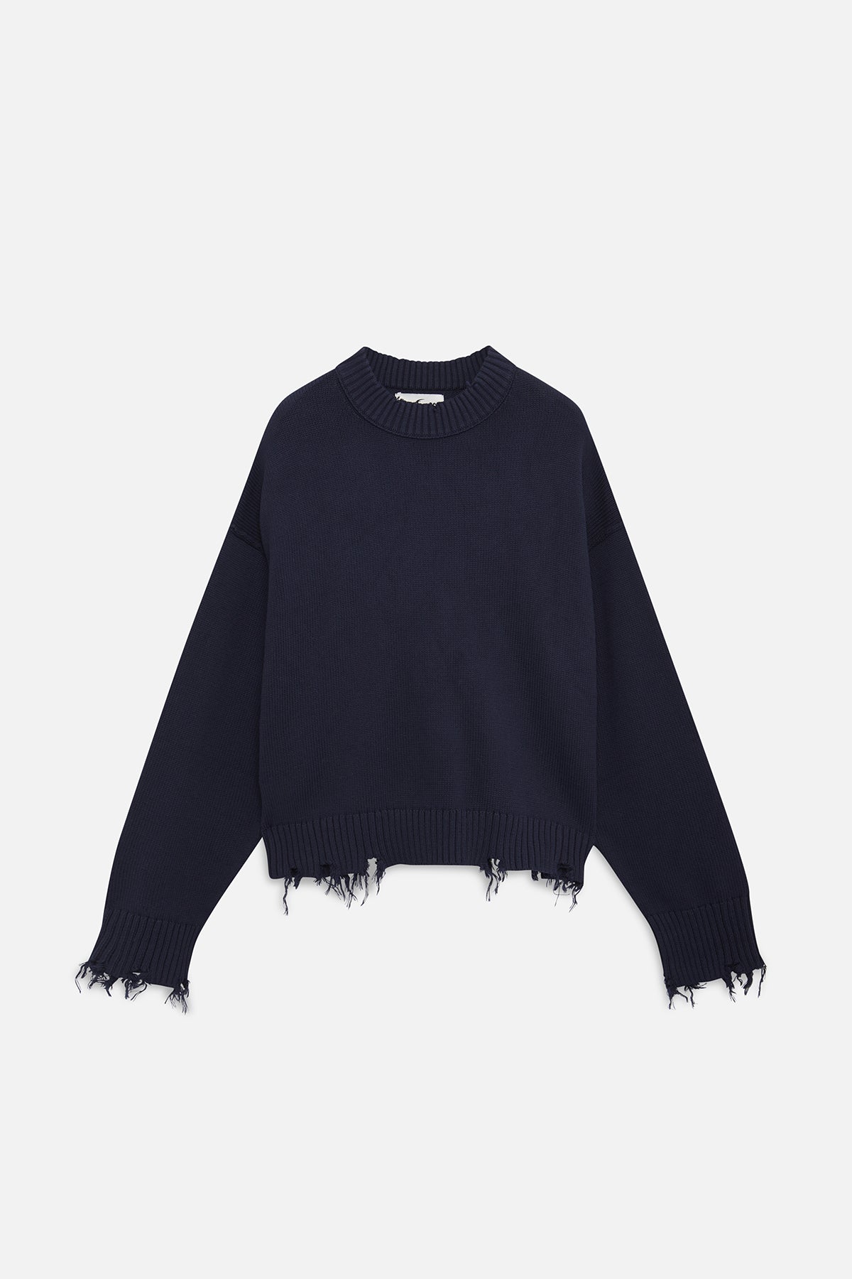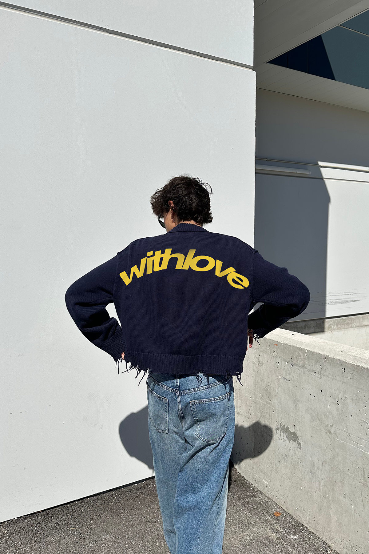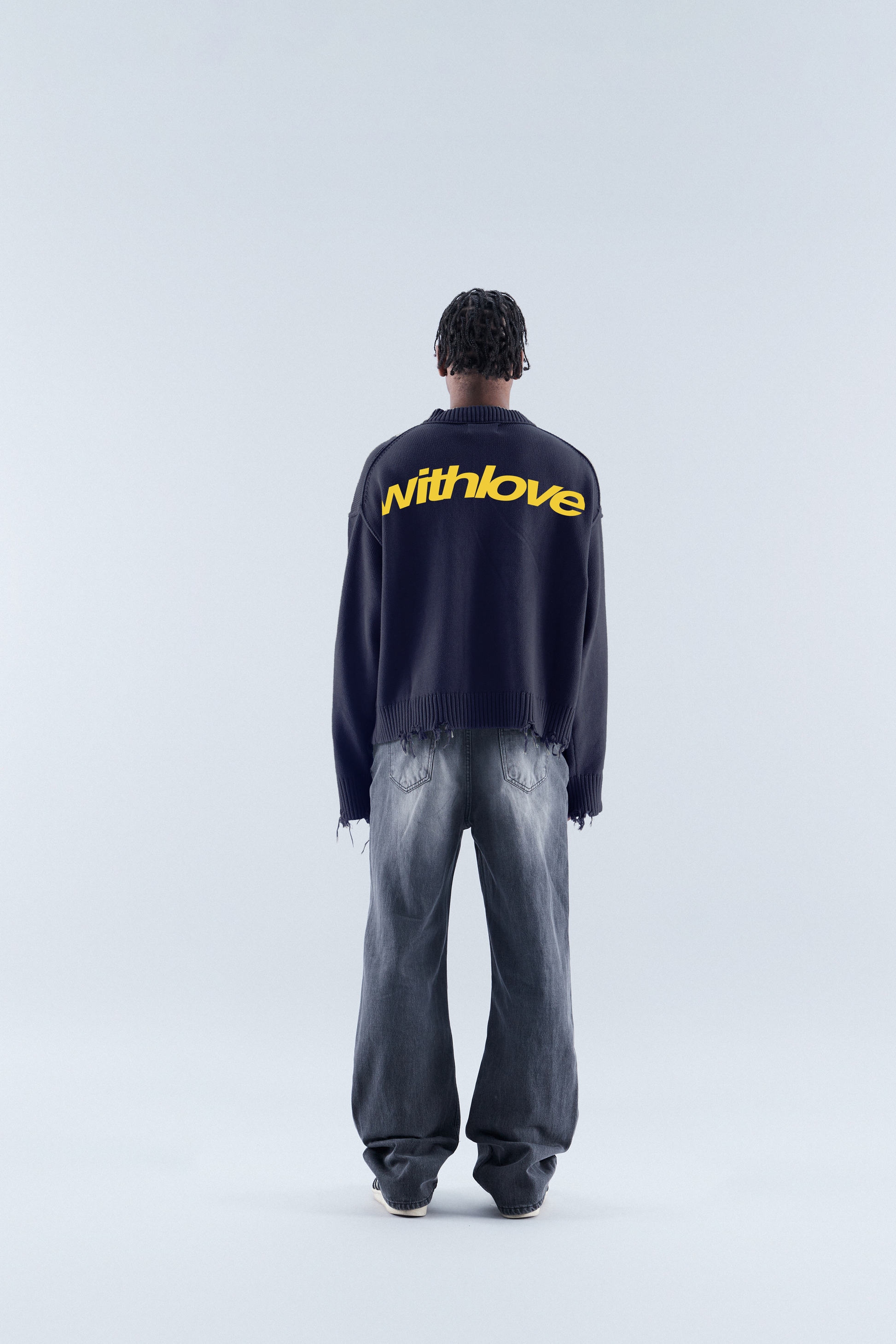 Luźna, unisexowa, granatowa dzianina. Logo „With love” nadrukowane na żółto. Przetarcia na rękawach, pasie i kołnierzyku.