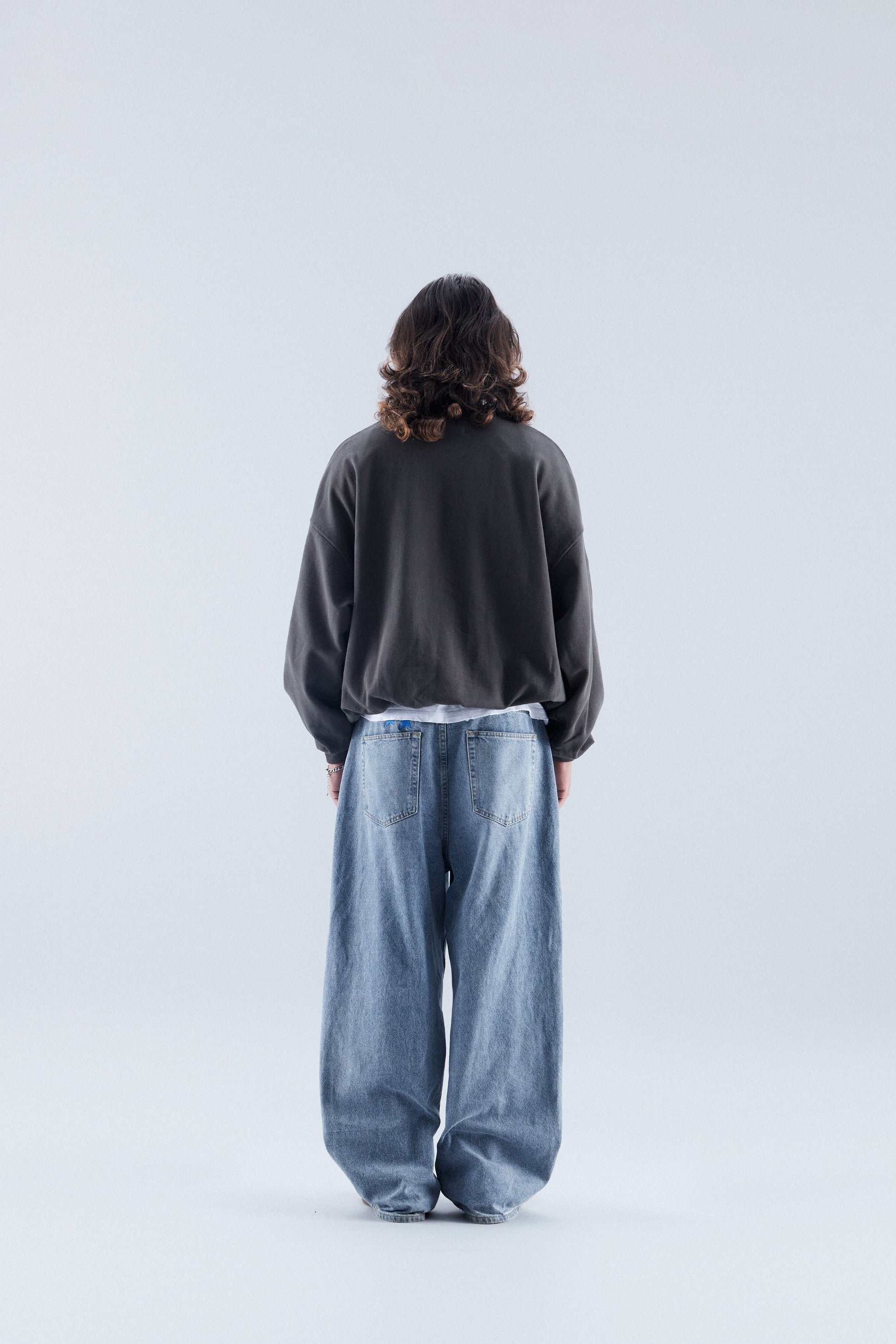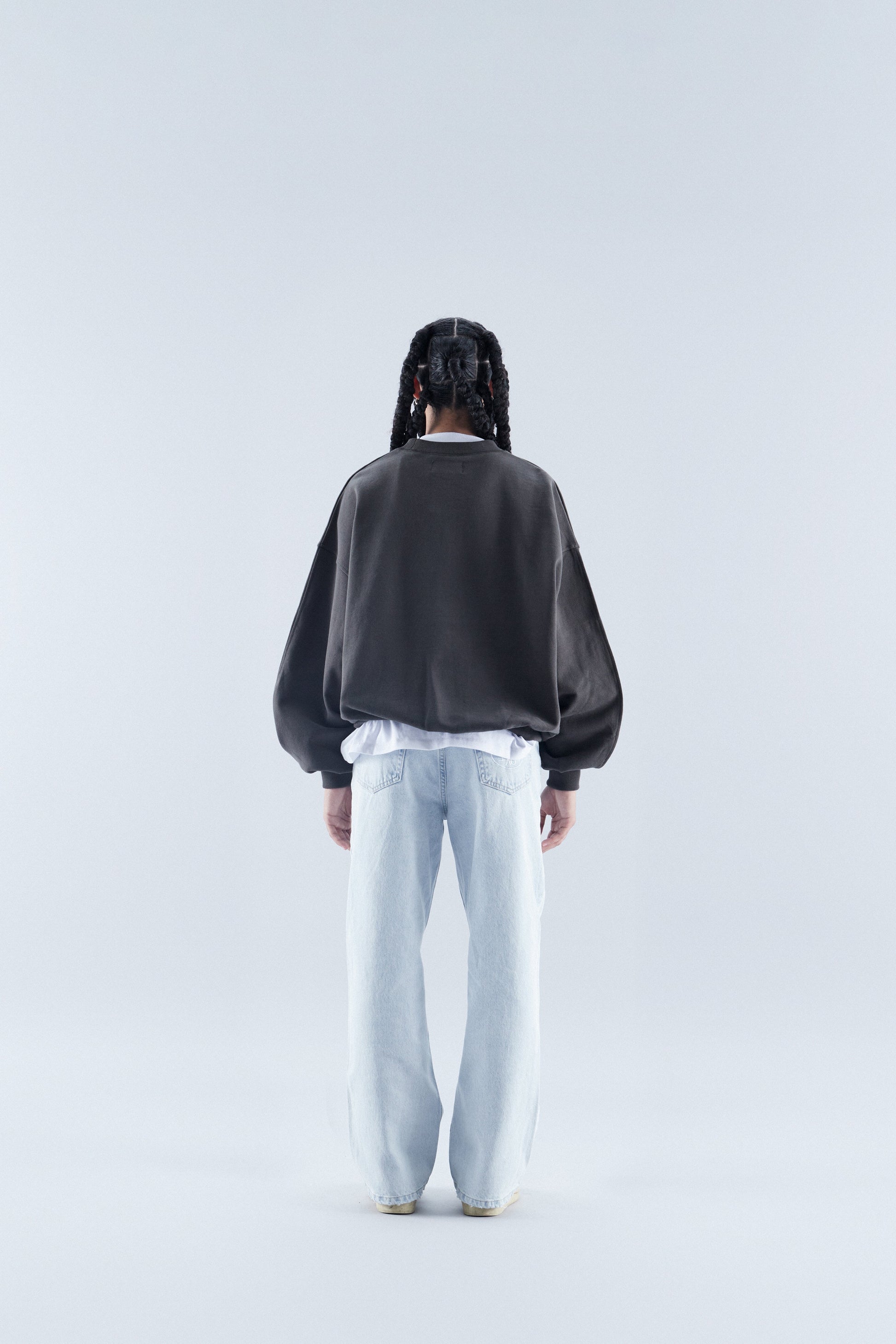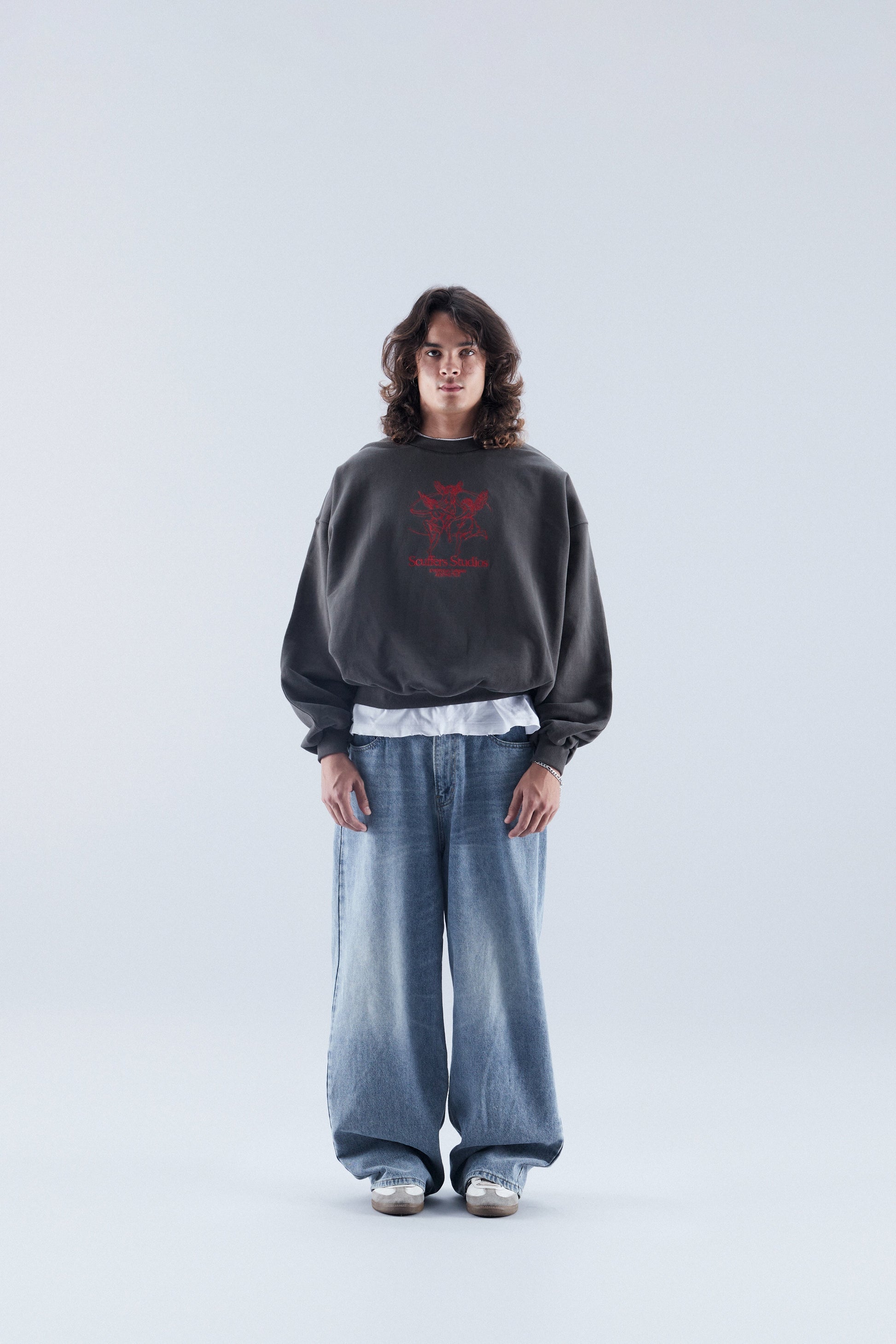 Bardzo ciężki, oversize'owy, pudełkowy sweter z okrągłym dekoltem w ciemnoszarym kolorze. Tańczące anioły i motyw „Everyday urban aesthetics” wyszyte na czerwono.