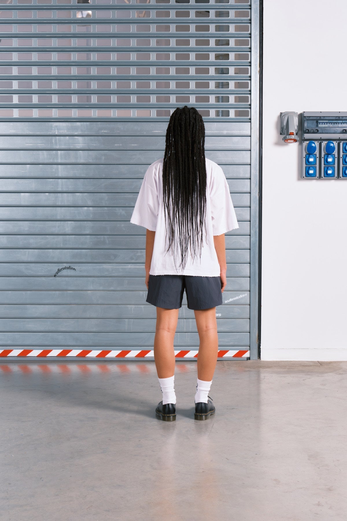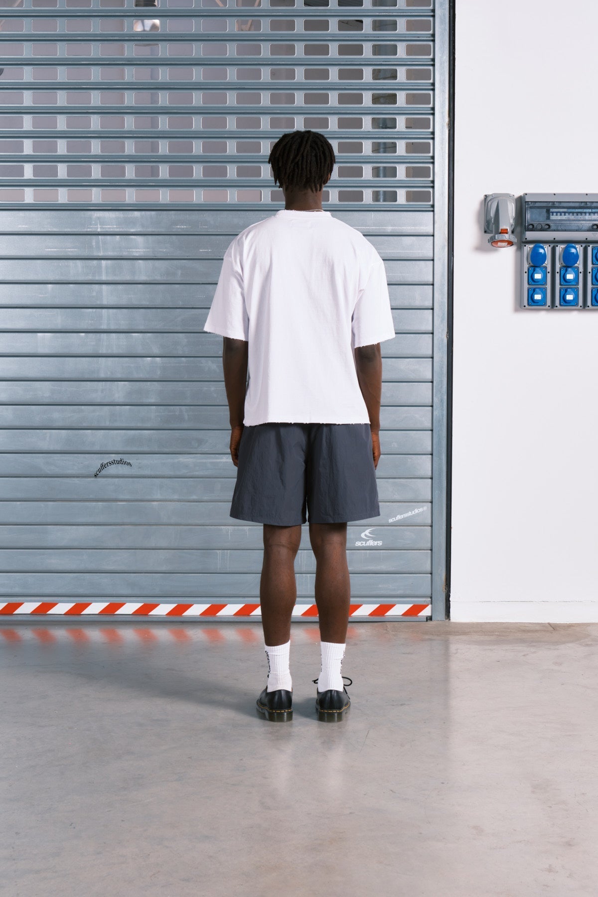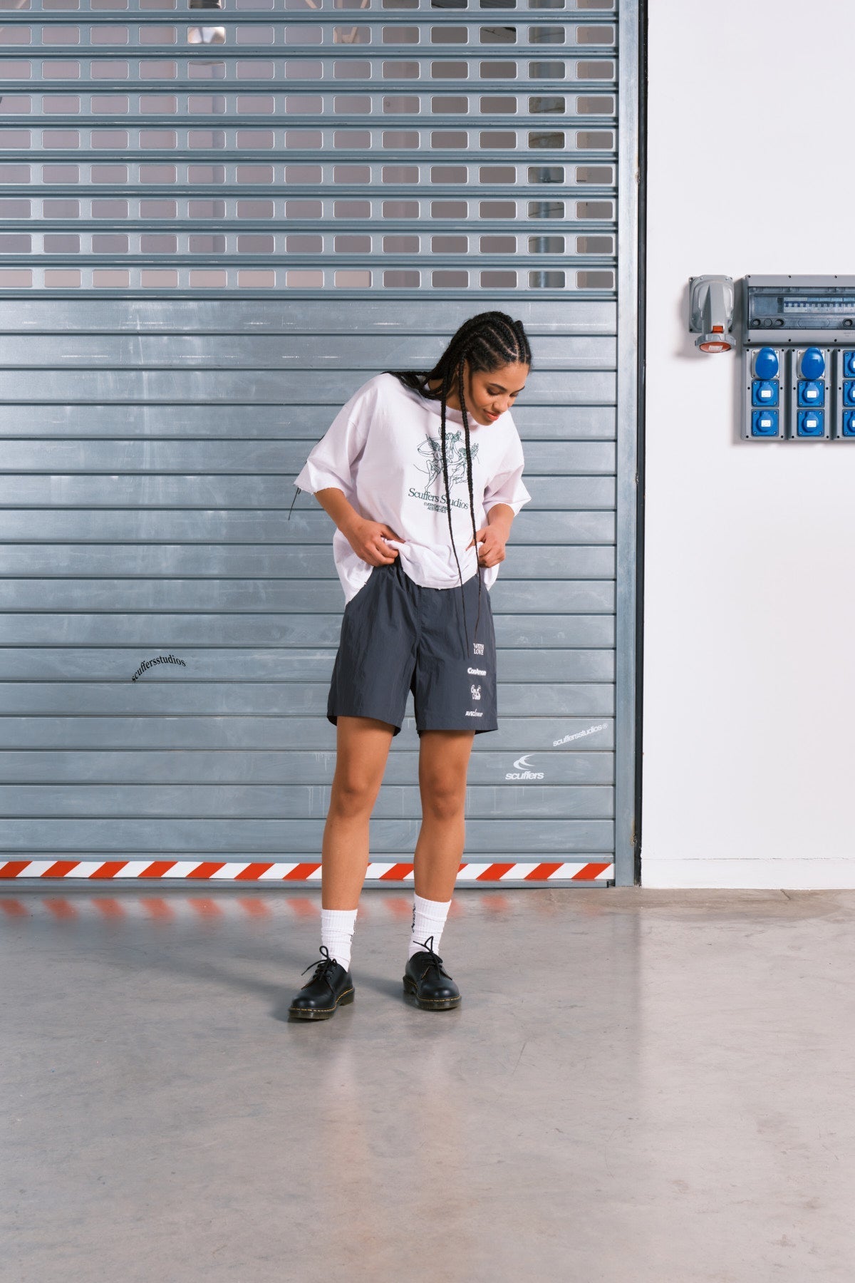 Granatowe, nylonowe szorty. Posiadają dwie kieszenie boczne i jedną tylną, kieszeń z patką zapinaną na guzik.