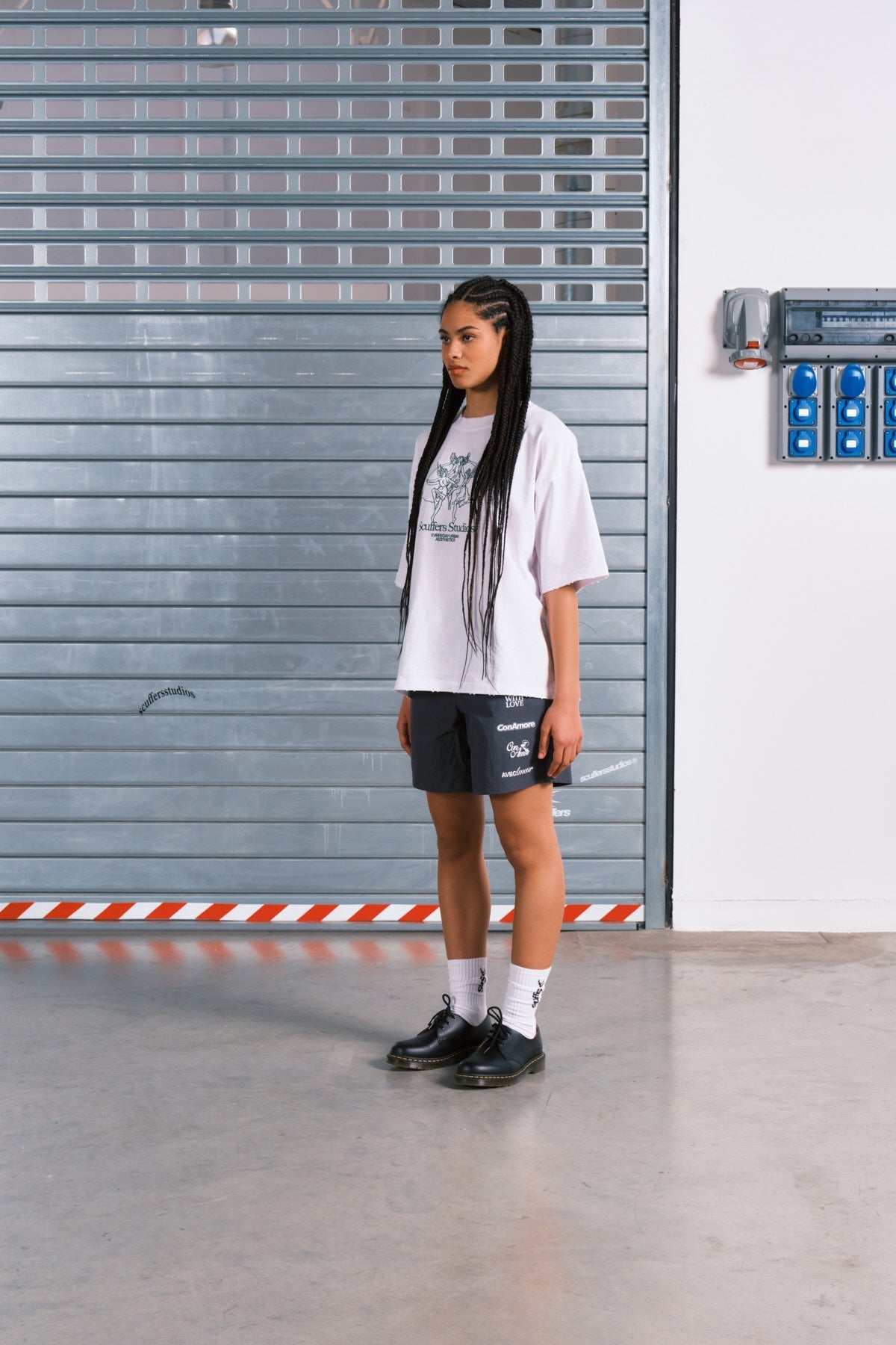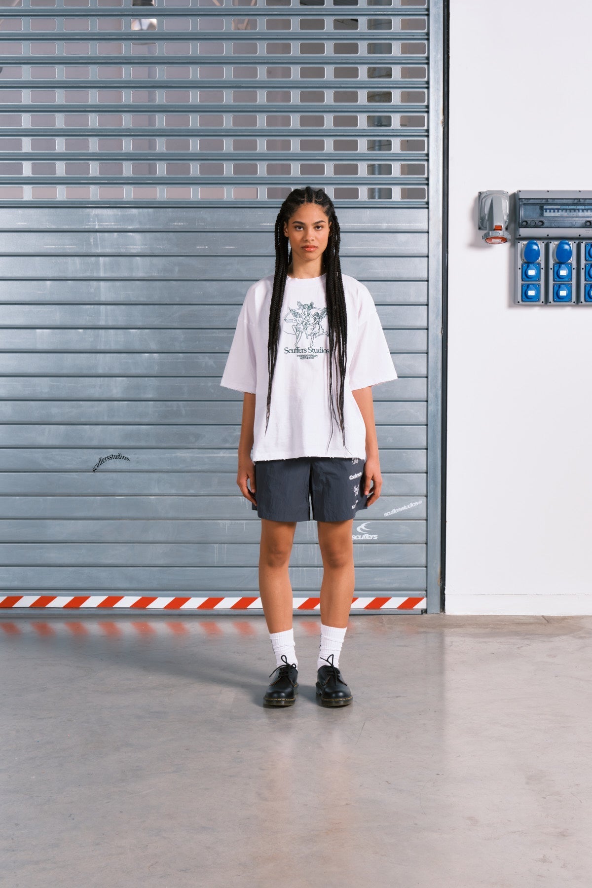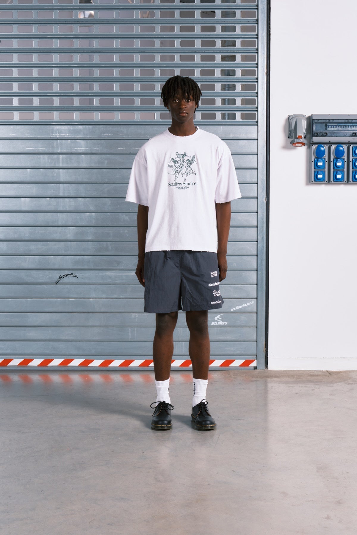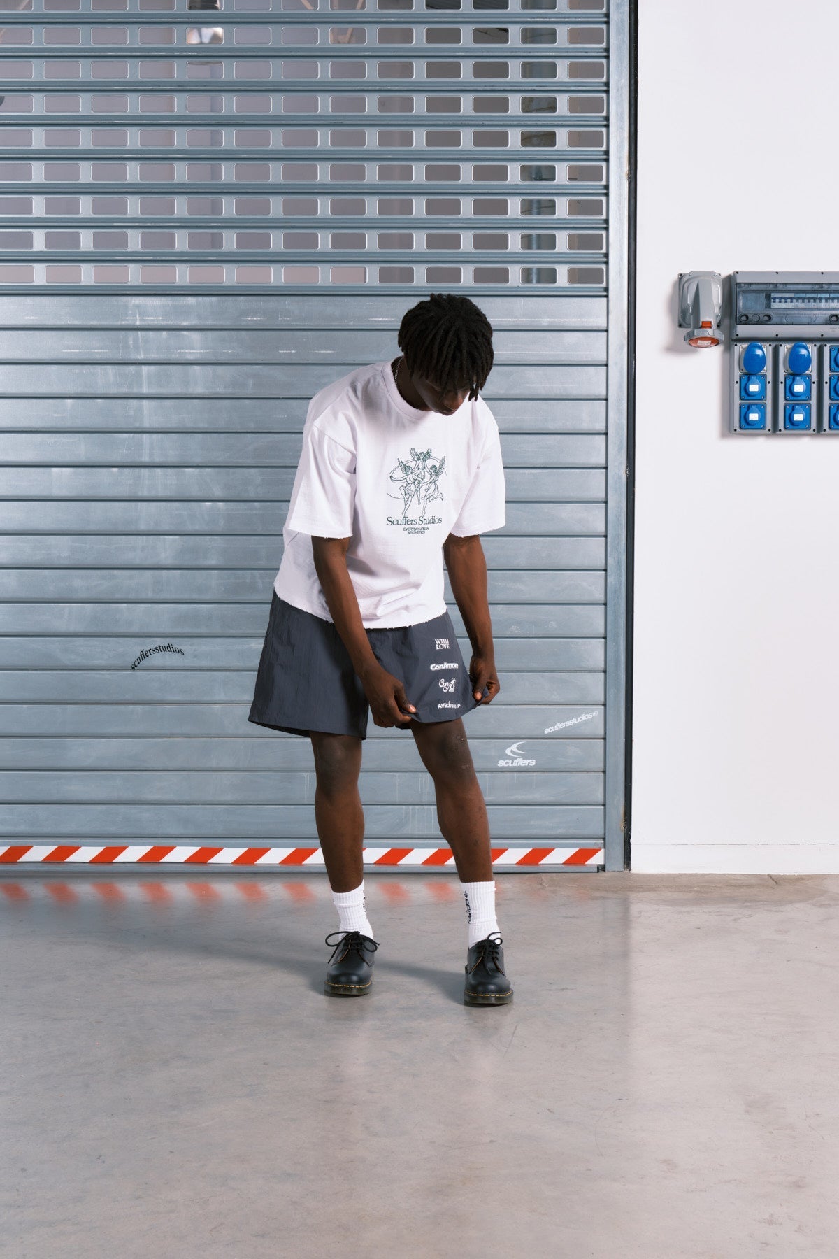 Granatowe, nylonowe szorty. Posiadają dwie kieszenie boczne i jedną tylną, kieszeń z patką zapinaną na guzik.