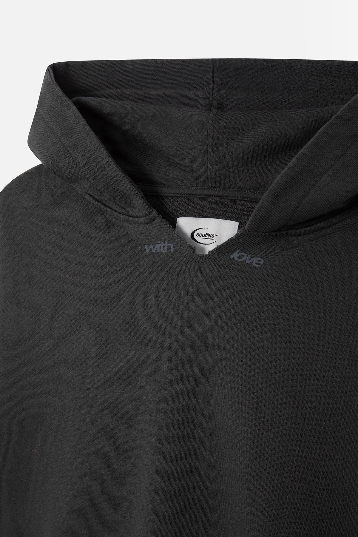 Czarna, ultralekka, oversize'owa bluza unisex z kapturem o dopasowanym kroju. Przerwany detal przy dekolcie z nadrukowanymi sitodrukiem "with" i "love" w tonalnej czerni po obu stronach kołnierza. Nadruk sitodrukowy "Scuffers" na górnej części pleców od ramienia do ramienia. Przeszycia z tyłu bluzy.