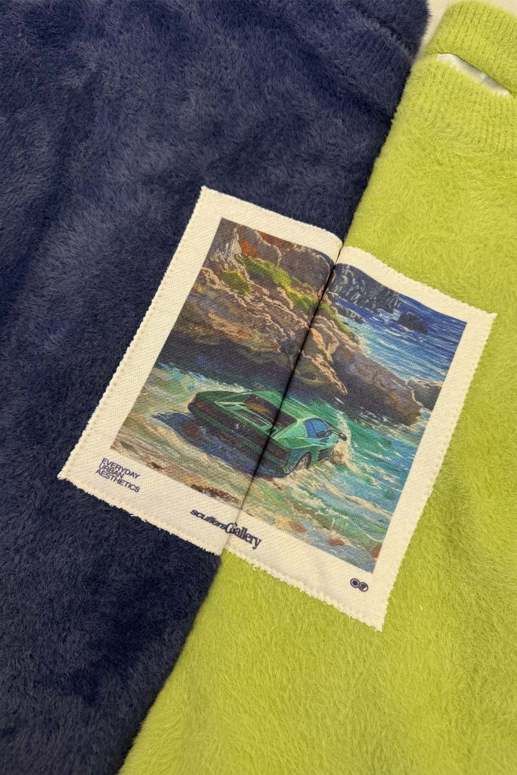 Granatowy sweter z dzianiny Fuzzy Knit o luźnym kroju i okrągłym dekolcie. Wykonany z miękkiej, teksturowanej tkaniny zapewniającej ciepło i wygodę. Z przodu zdobiona jest kolorowa, malownicza grafika dla dodatkowego detalu. Ściągacze przy mankietach i u dołu zapewniają idealne dopasowanie.
