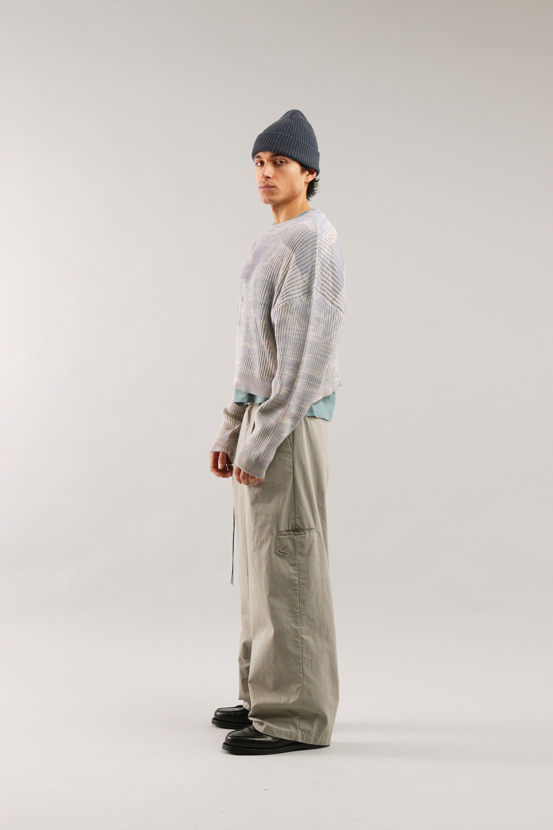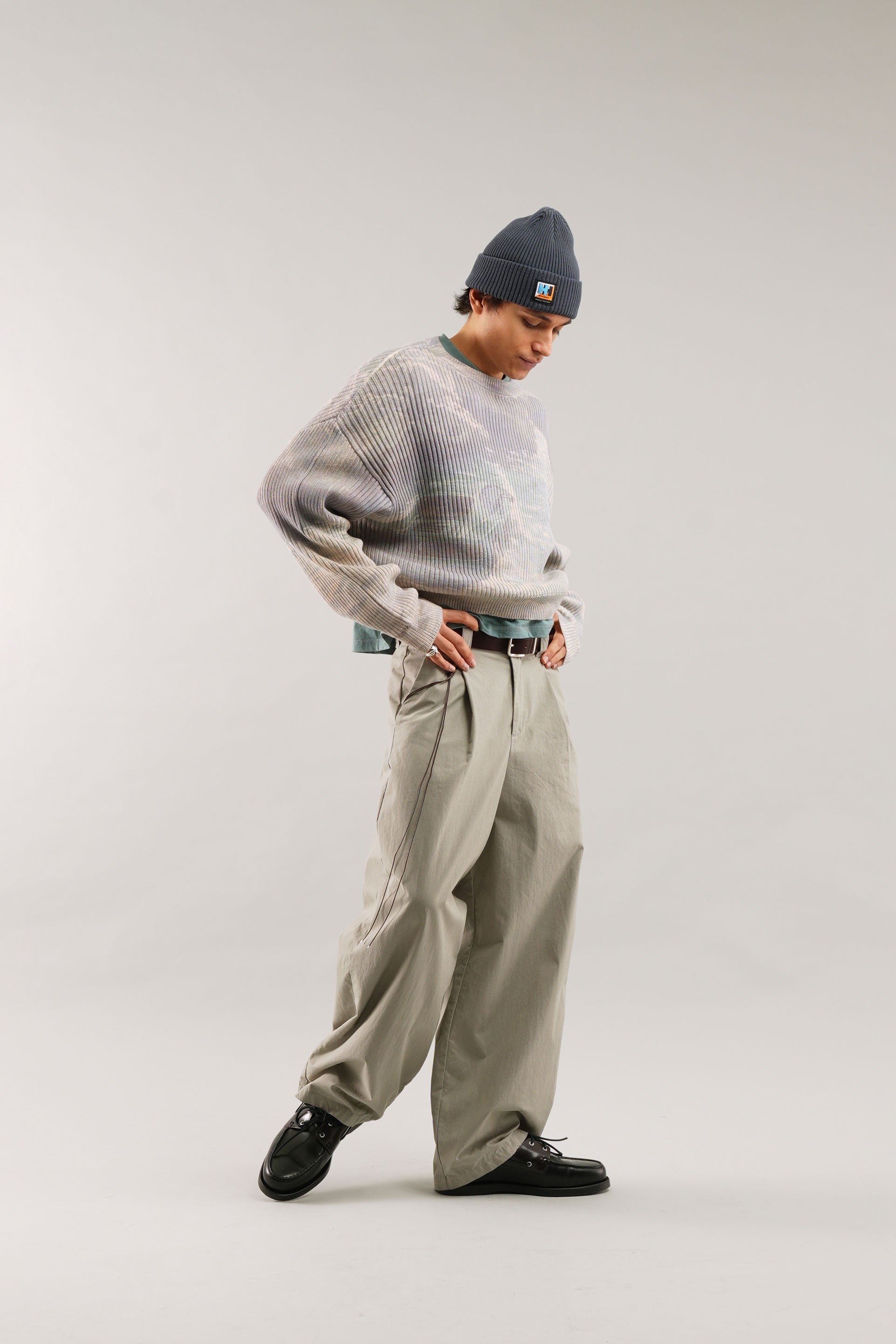 Prążkowany sweter z długim rękawem i grafiką, z malowniczym nadrukiem w stonowanych barwach. Wykonany z miękkiej, teksturowanej dzianiny o luźnym kroju. Okrągły dekolt, ściągacze przy mankietach i u dołu zapewniają stabilność. Uniwersalny, wyrazisty element garderoby z subtelnym, artystycznym wzorem.