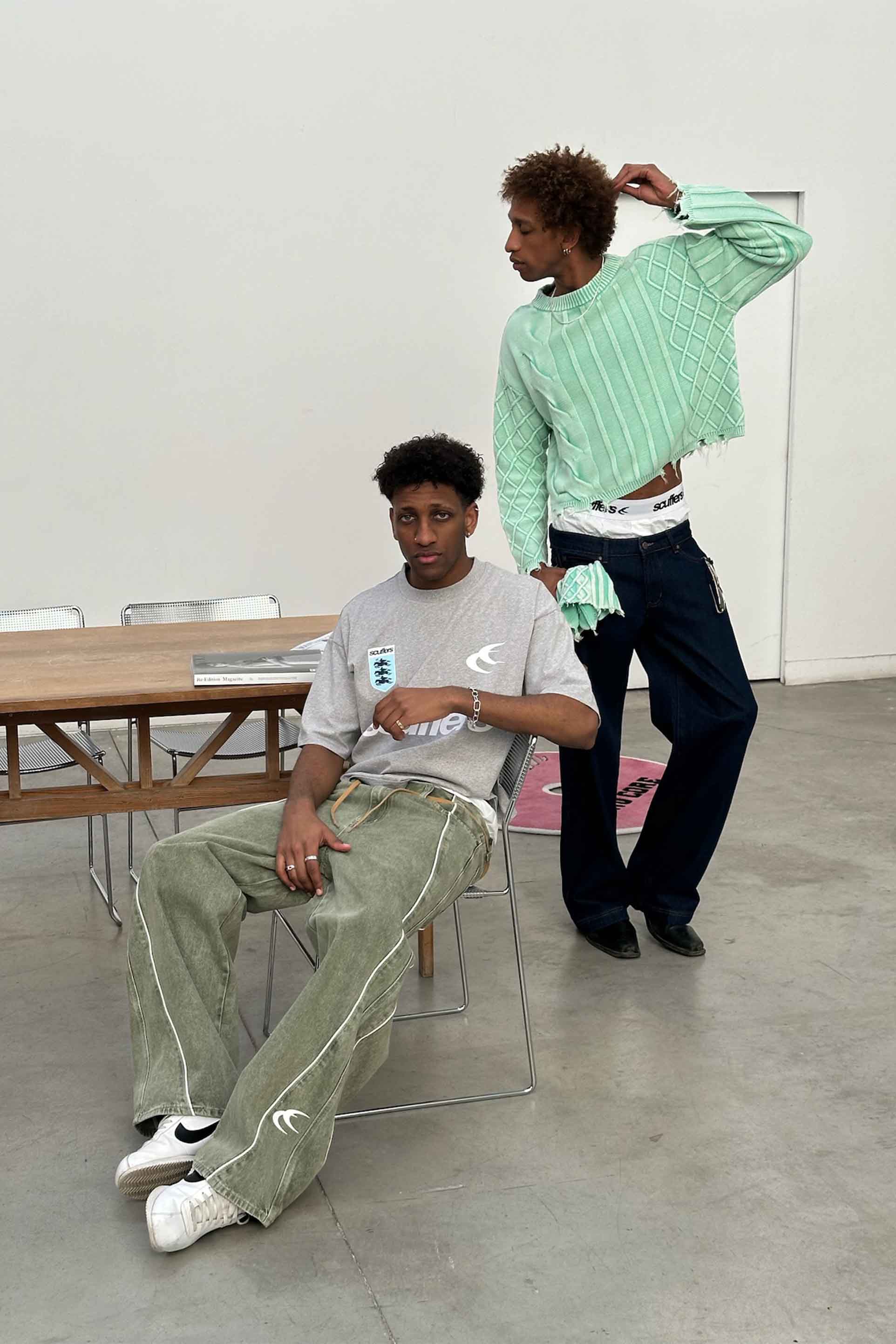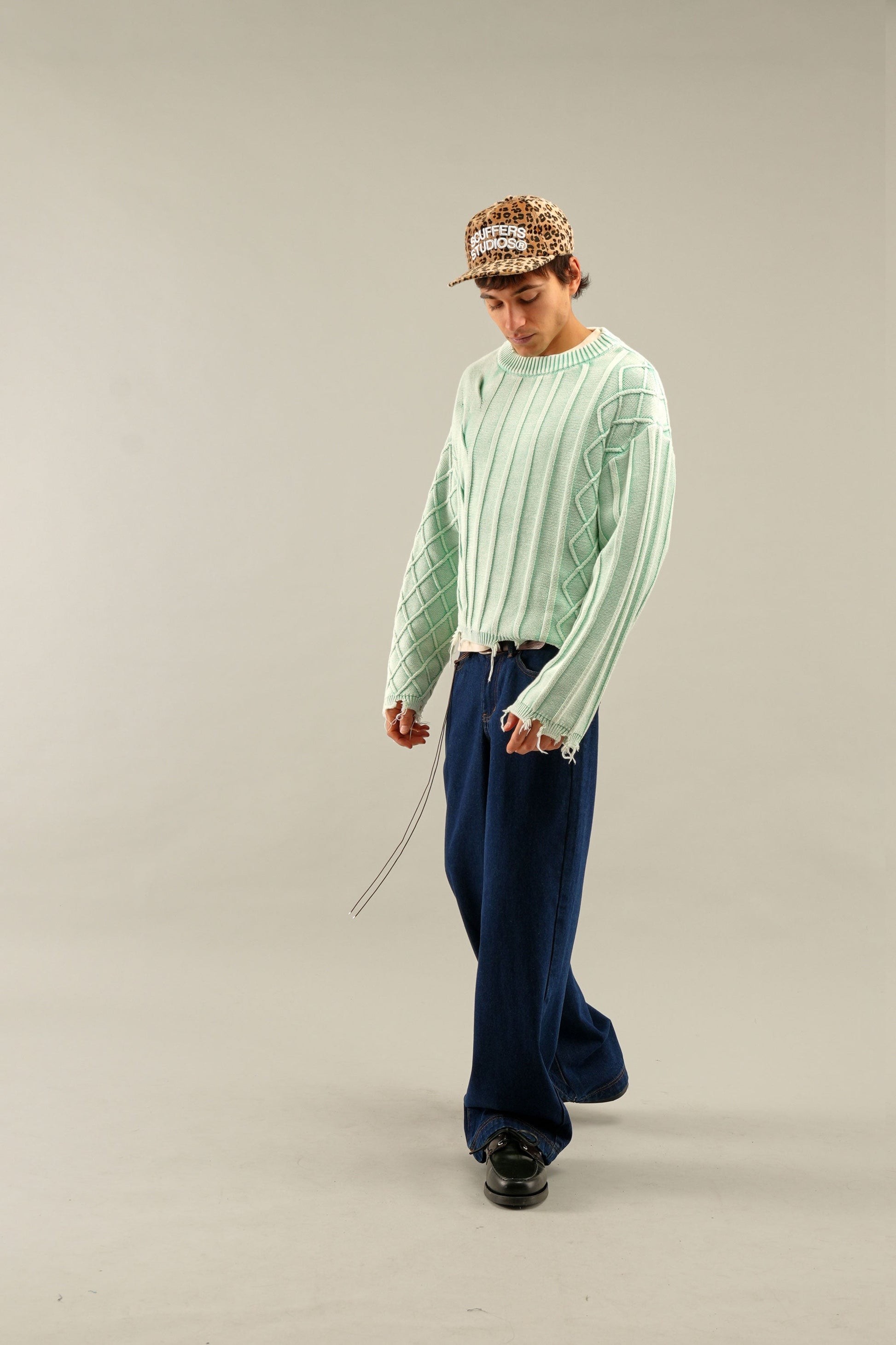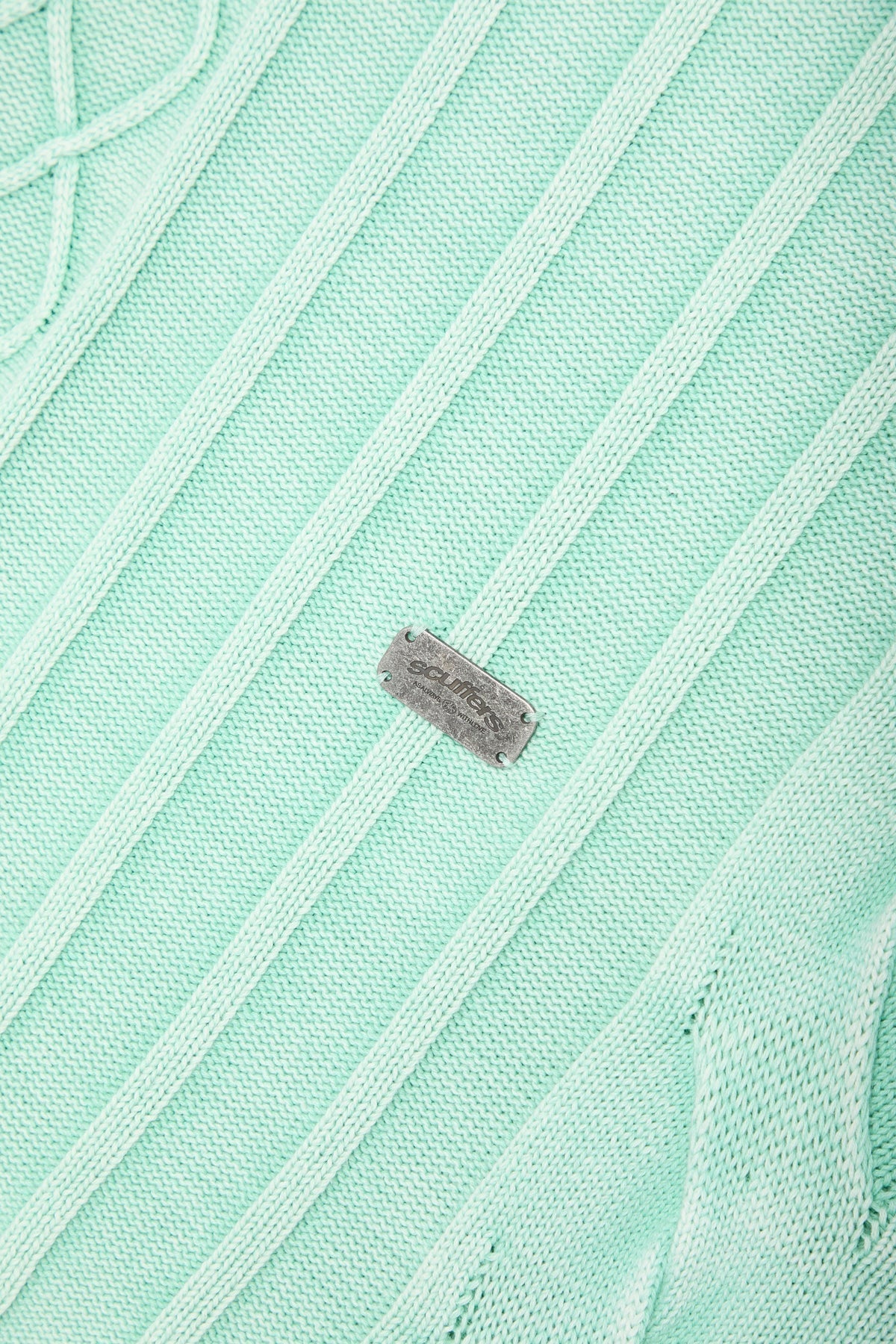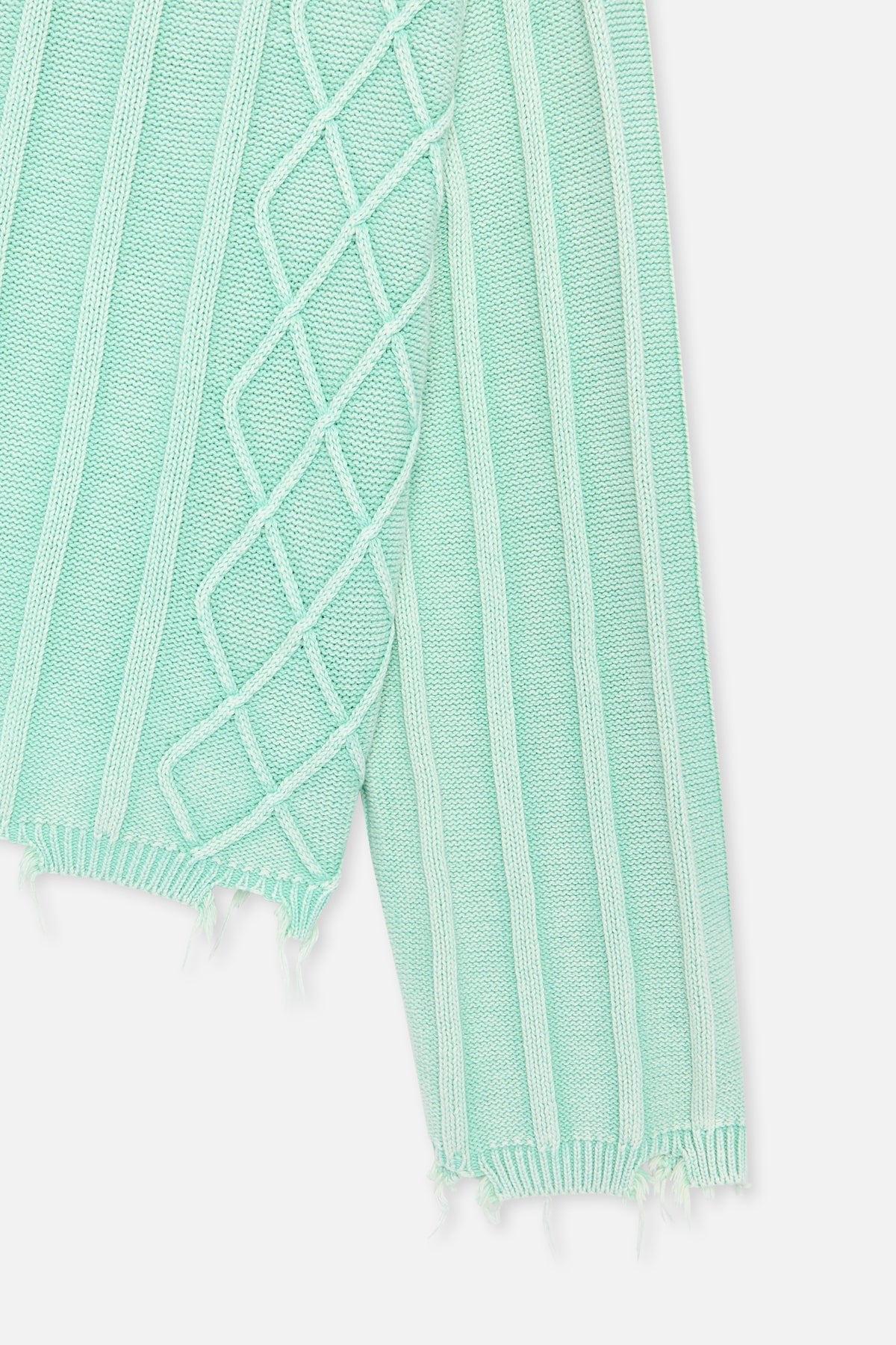 Dzianina w kolorze spranej mięty i zieleni, z połączeniem splotu warkoczowego i prążkowanego. Wykonana z miękkiej, średniej grubości tkaniny o luźnym kroju. Surowe wykończenie u dołu i mankietów nadaje efekt przetarcia. Prążkowany okrągły dekolt i subtelne metalowe logo z tyłu.