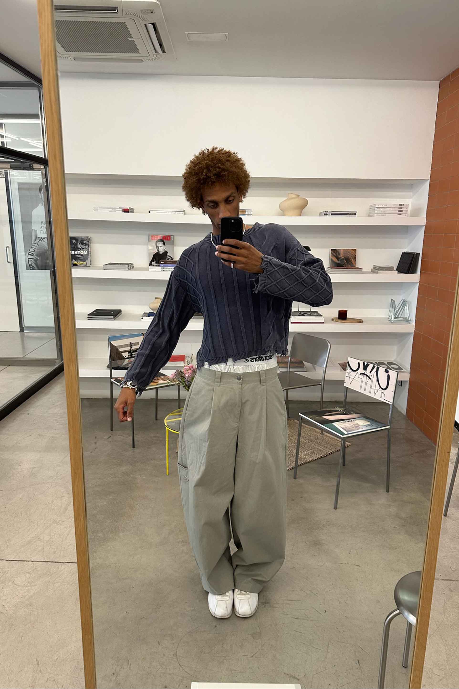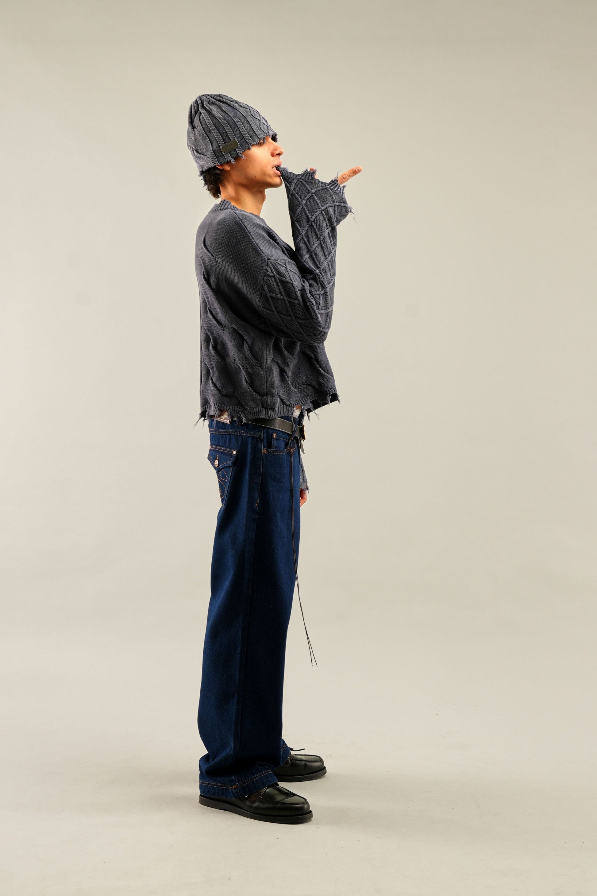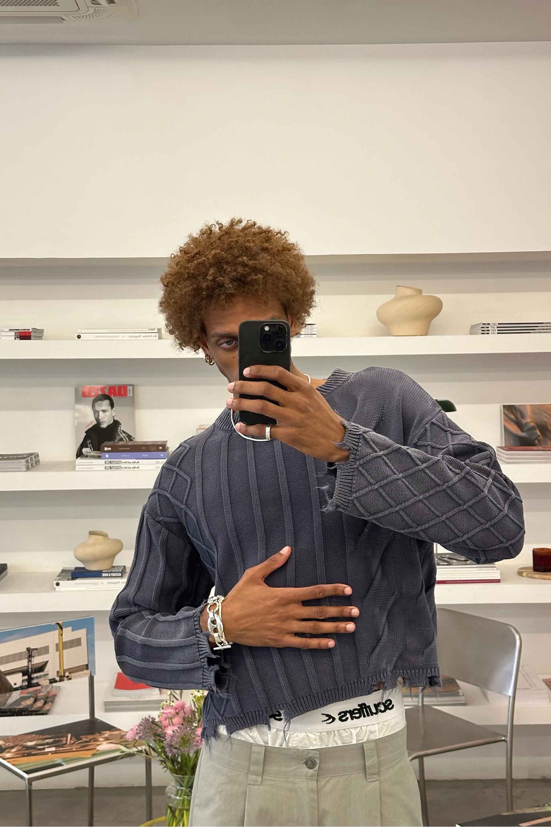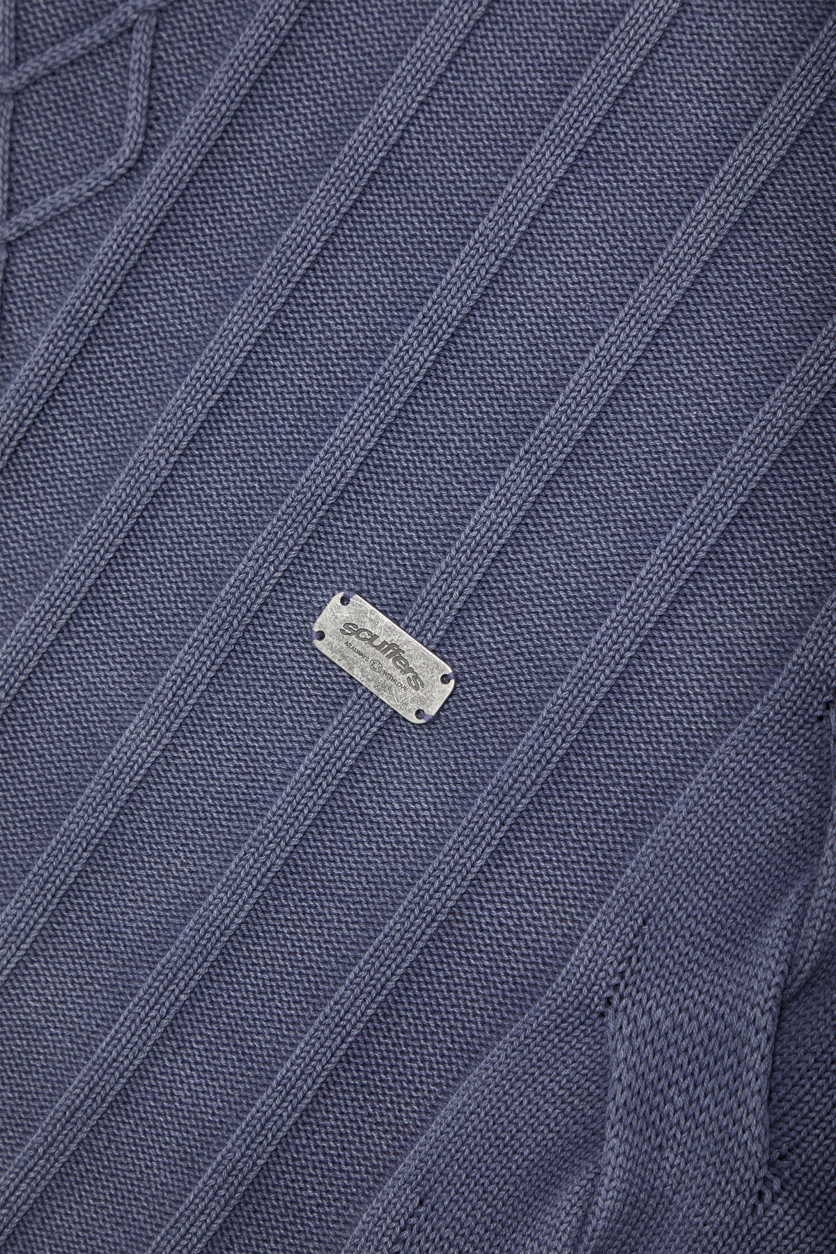Dzianina w kolorze spranego błękitu z połączeniem splotu warkoczowego i prążkowanego. Wykonana z miękkiej, średniej grubości tkaniny o luźnym kroju. Surowe wykończenie u dołu i mankietów nadaje efekt przetarcia. Prążkowany okrągły dekolt i subtelne metalowe logo z tyłu.
