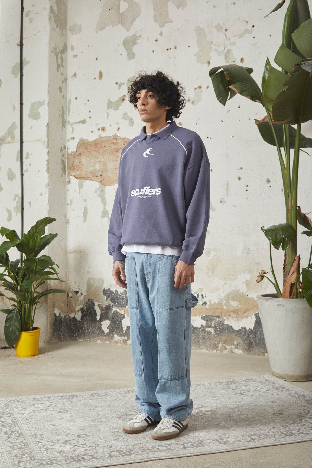 Granatowa, oversize'owa, gruba koszulka polo. Z przodu nadruk sitodrukowy z logo „Scuffers” i podwójnym księżycem w kolorze białym. Wzmocnione, elastyczne szwy na rękawach i plecach.