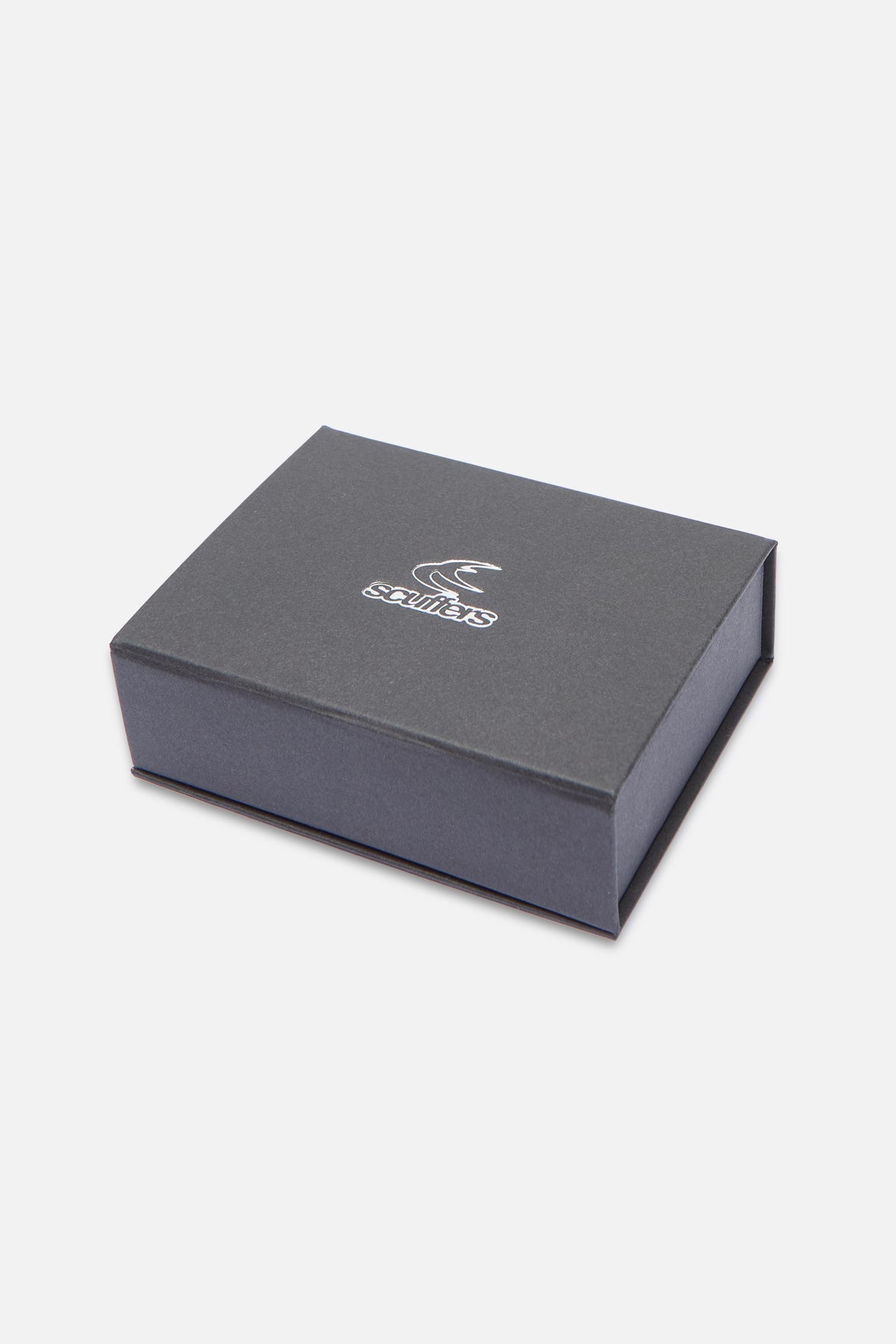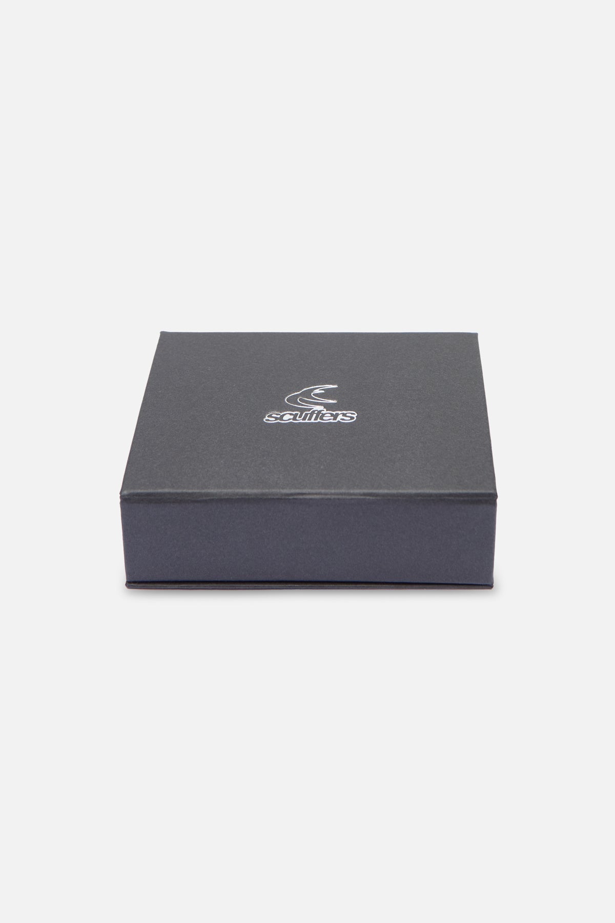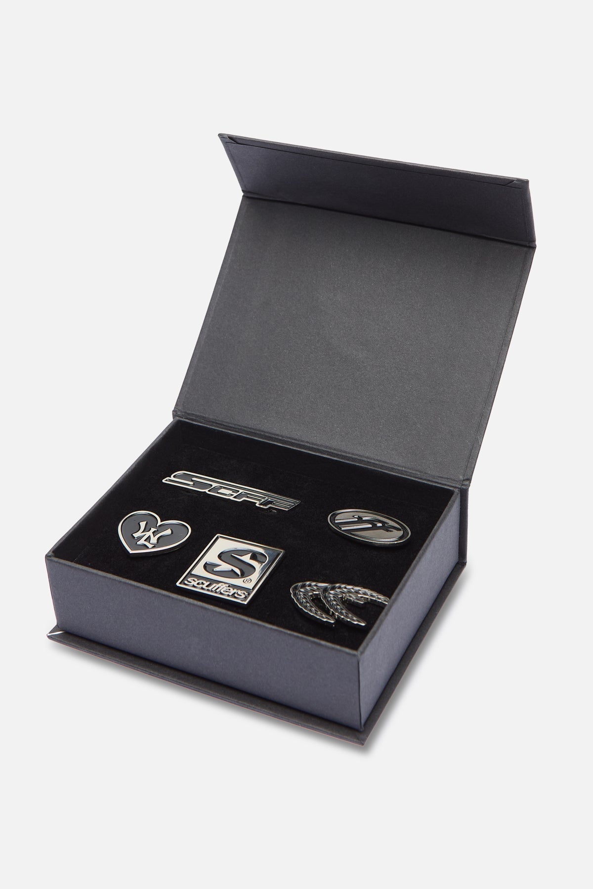 Zestaw metalowych przypinek z sześcioma różnymi wzorami, w tym z logo „SCFF”, sercem, owalną przypinką, kwadratową przypinką „Scuffers”, emblematem pszenicy oraz logo Scuffers w odcieniach srebra. Przypinki są dostarczane w czarnym pudełku prezentowym z subtelnym logo „Scuffers” na wieczku, co czyni je stylowym dodatkiem do kolekcji lub prezentem.