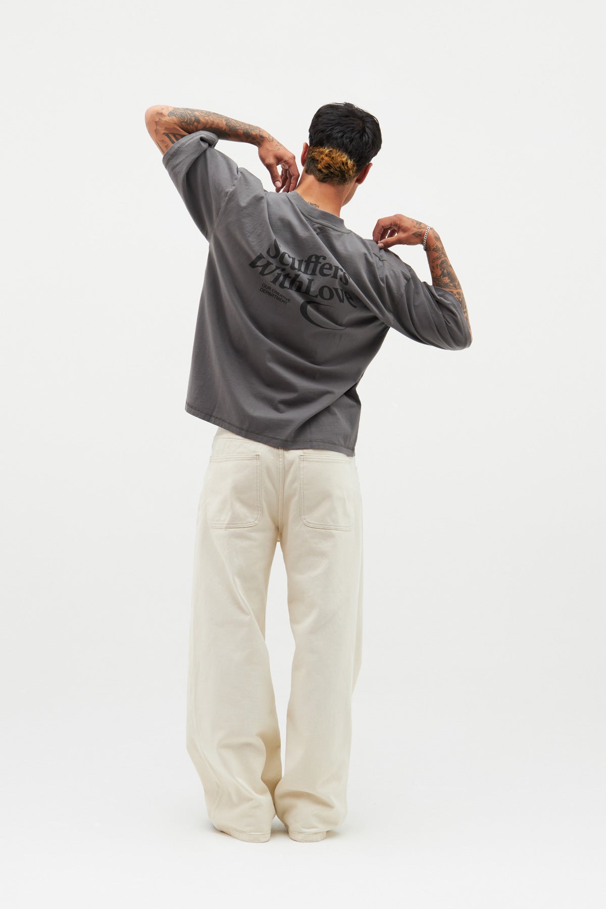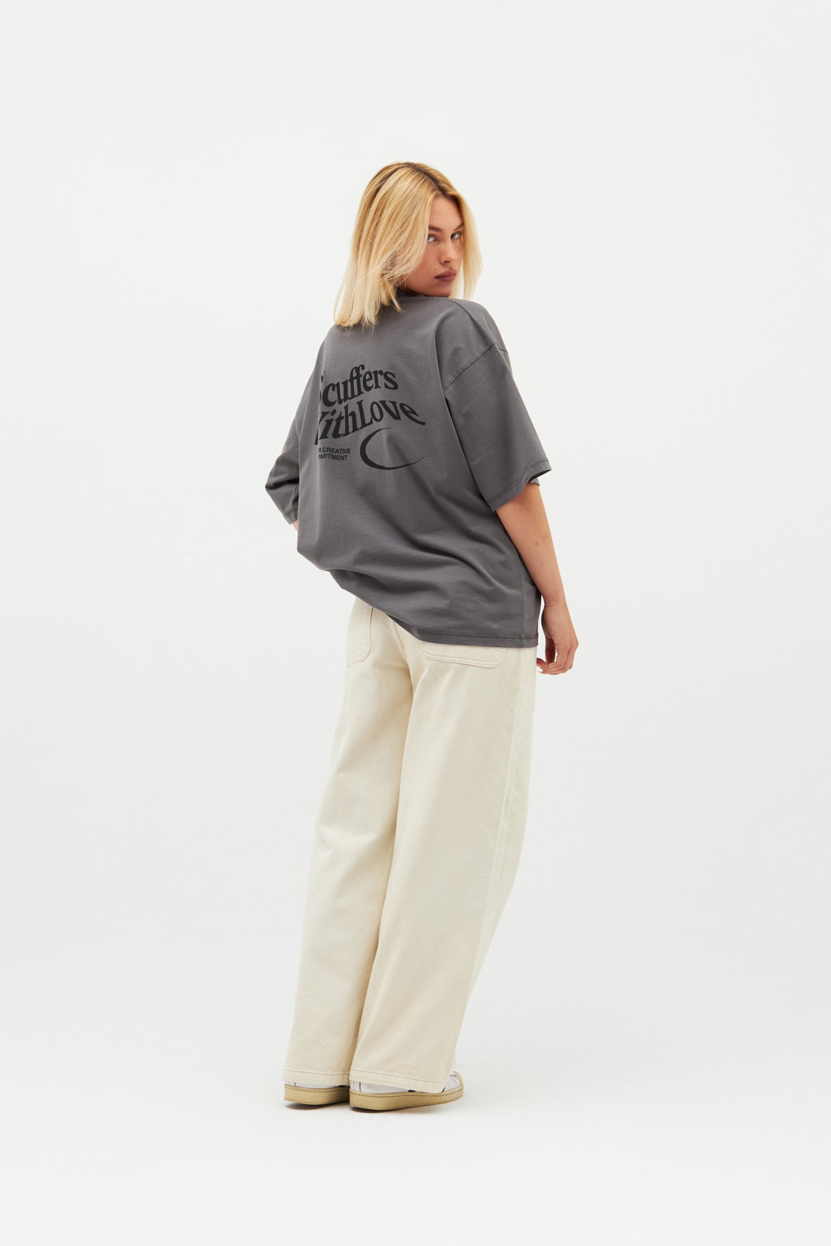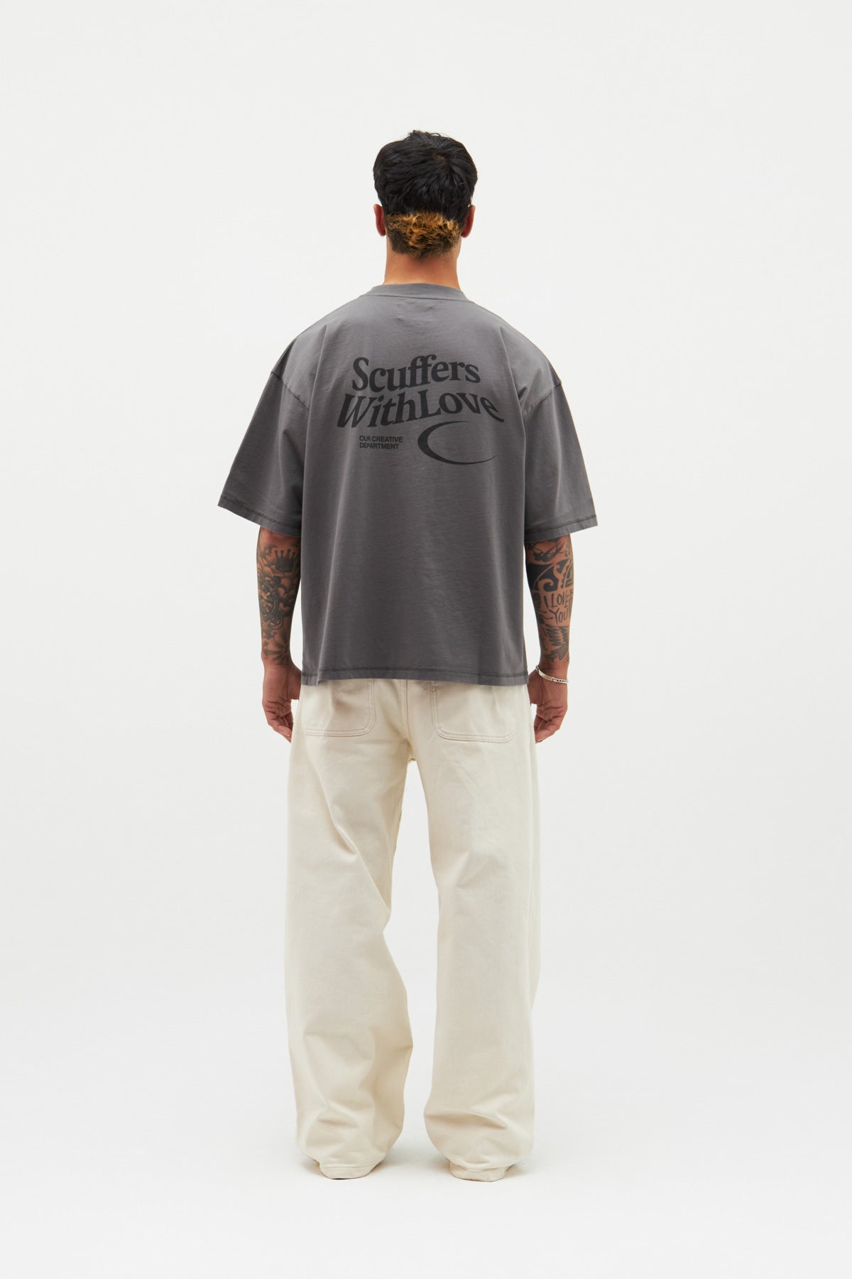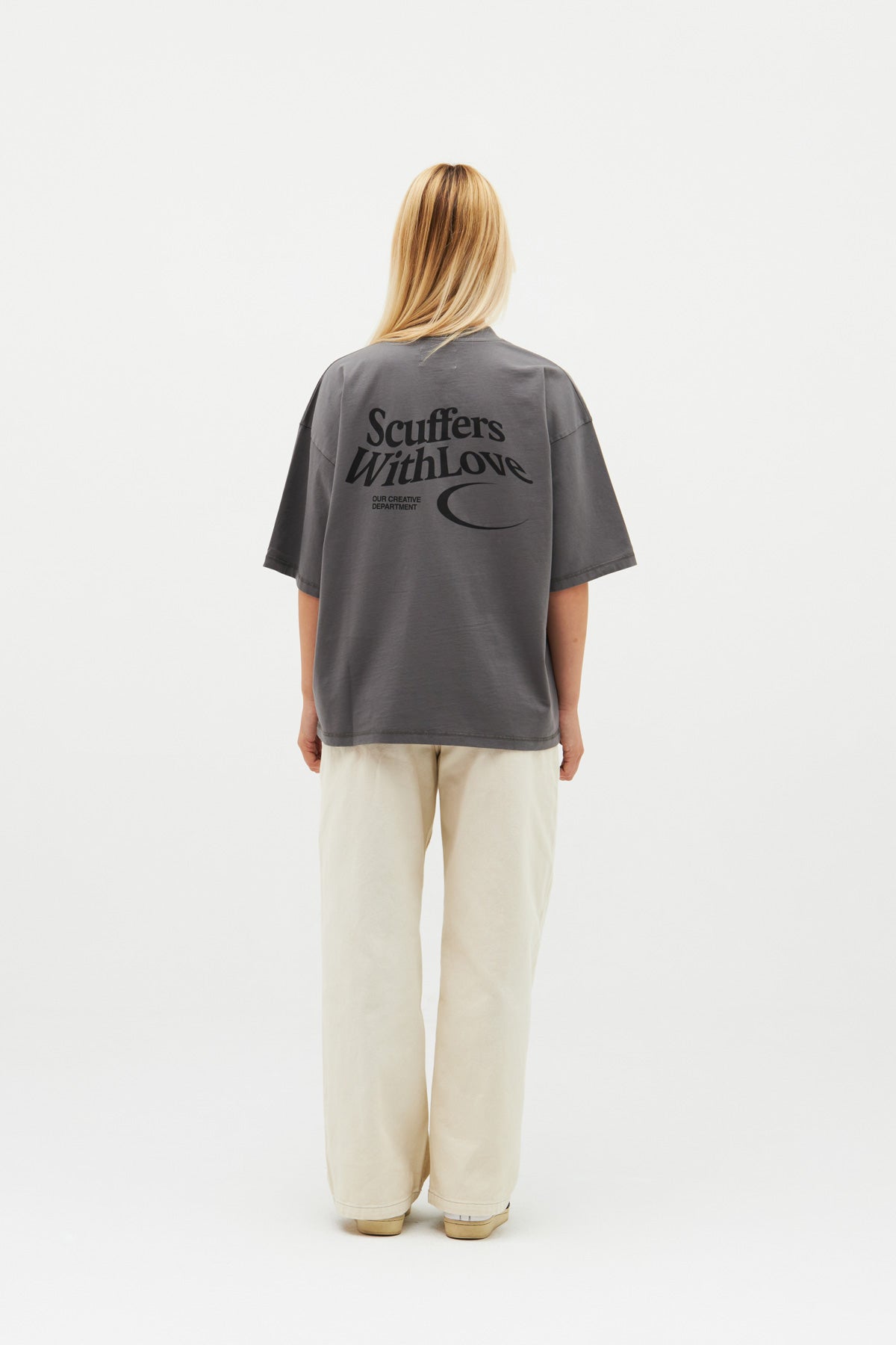 Luźna koszulka w kolorze ciemnoszarym. Logo z podwójnym księżycem z przodu i nasz kultowy slogan „Scuffers, With Love” nadrukowany sitodrukiem z tyłu w kolorze czarnym.