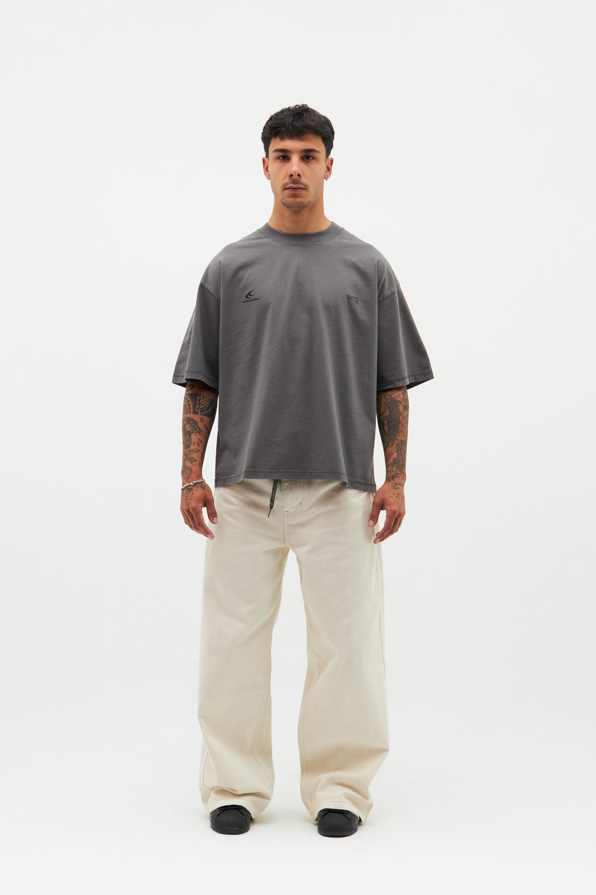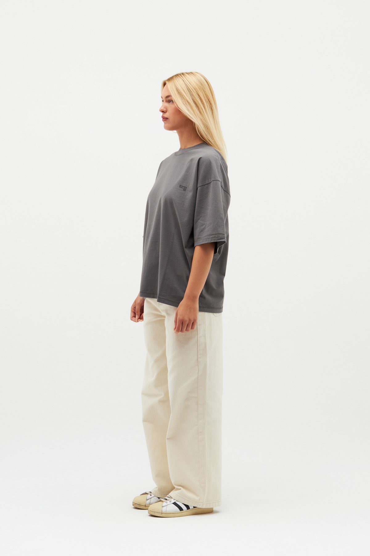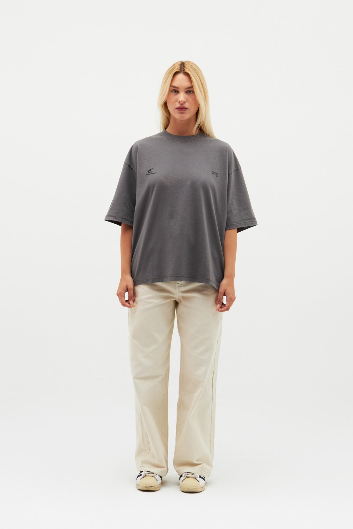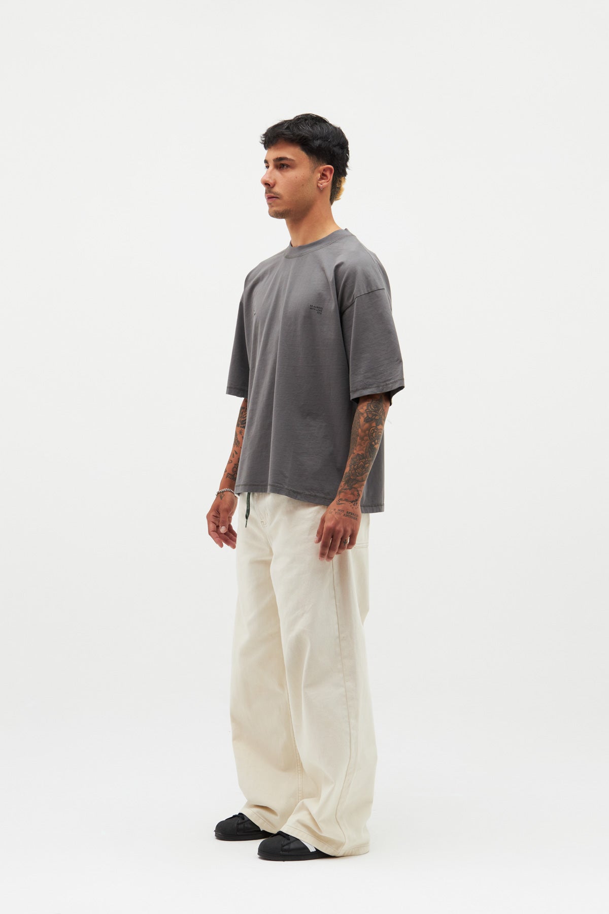 Luźna koszulka w kolorze ciemnoszarym. Logo z podwójnym księżycem z przodu i nasz kultowy slogan „Scuffers, With Love” nadrukowany sitodrukiem z tyłu w kolorze czarnym.