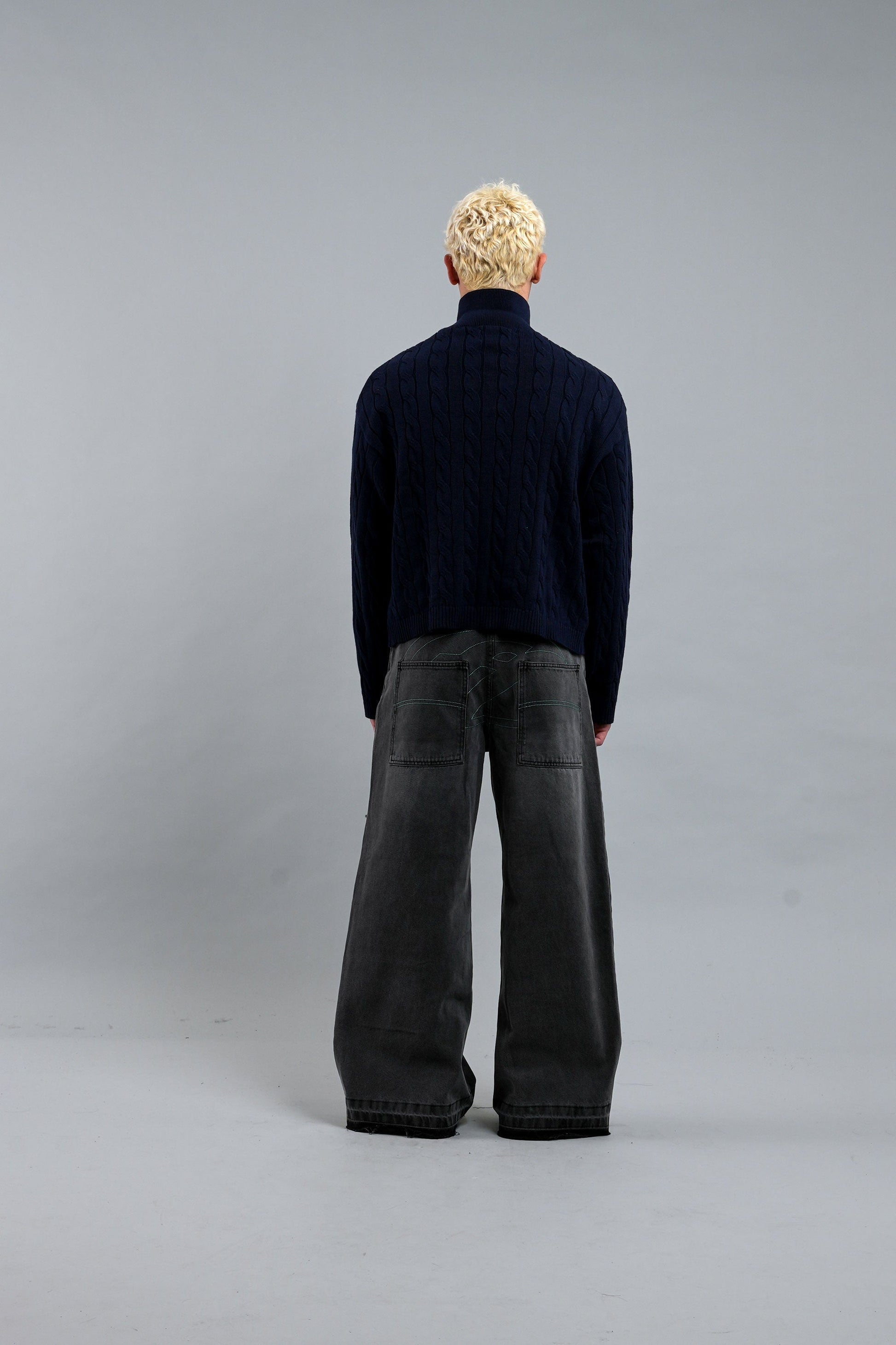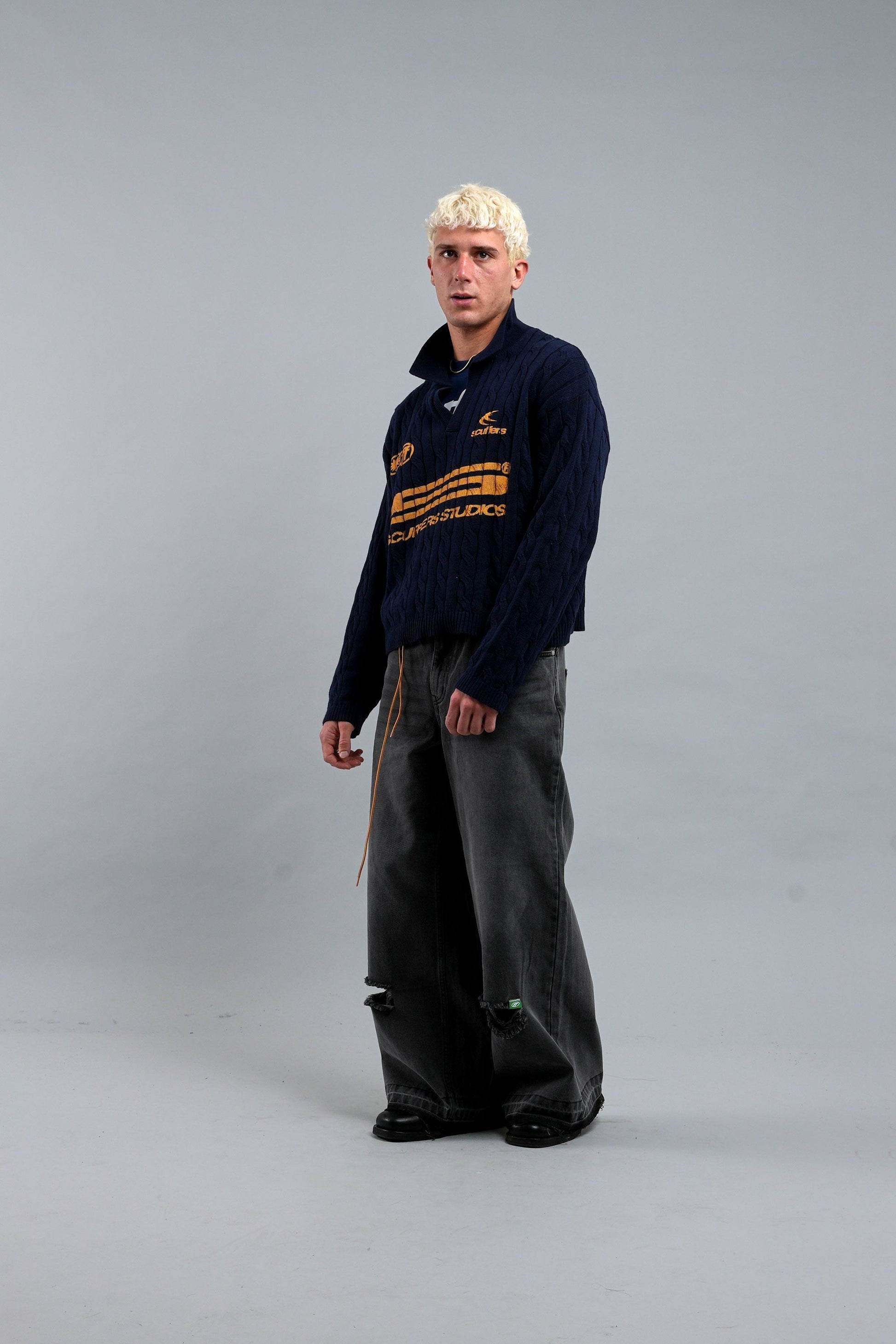 Granatowy sweter polo o kroju trencza, wykonany z miękkiej, oddychającej bawełny, zapewniającej wygodę. Charakteryzuje się teksturowanym splotem warkoczowym, kołnierzykiem z listwą w kształcie litery V oraz ściągaczami przy mankietach i u dołu. Kontrastują z nim wyraziste, żółte logo graficzne i napisy z przodu, łącząc klasyczną estetykę z nowoczesnym brandingiem. Idealny do noszenia warstwowego lub samodzielnie.