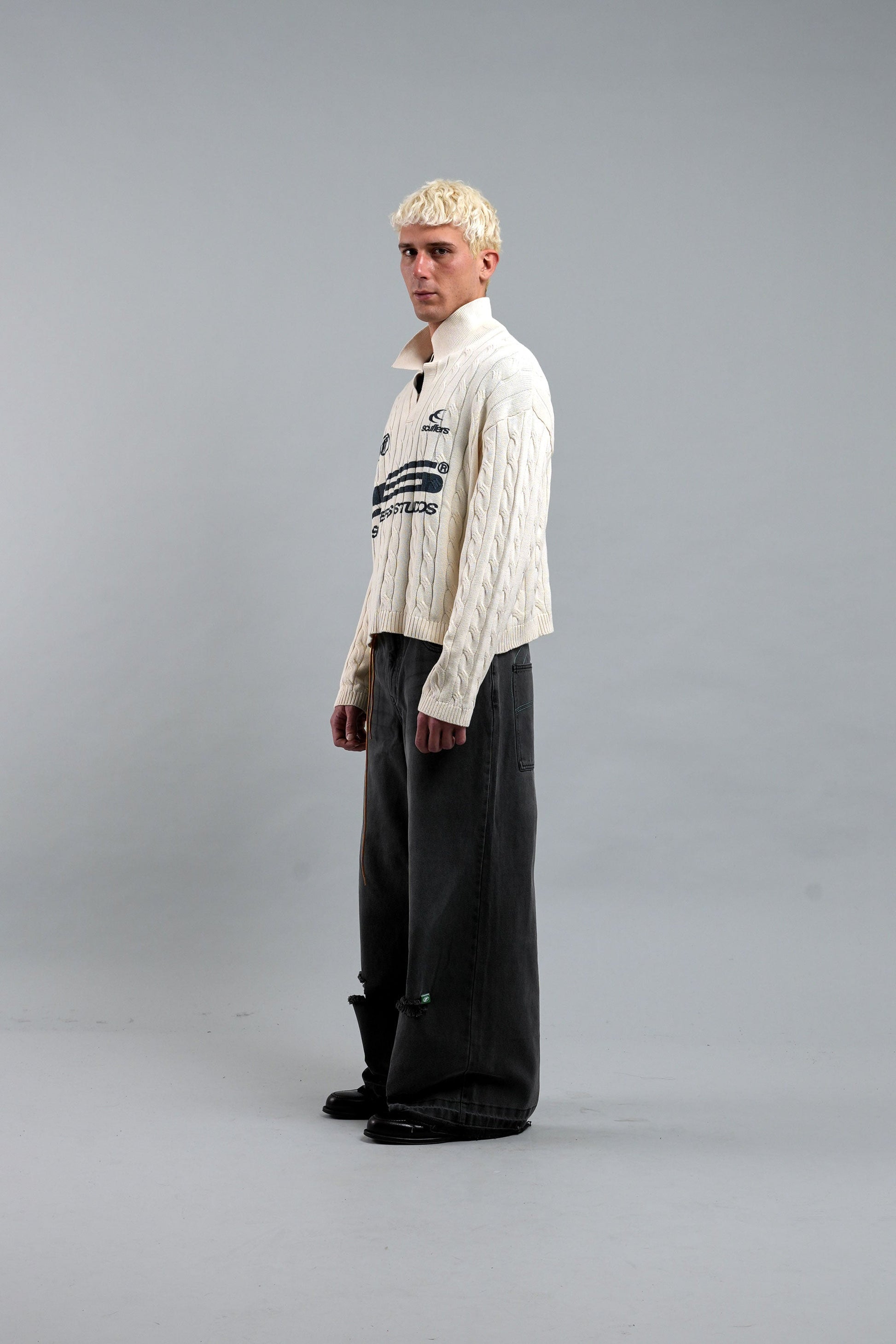 Sweter polo w kolorze ecru, wykonany z miękkiej, oddychającej bawełny, zapewniającej wygodę. Posiada teksturowany splot warkoczowy, kołnierzyk z listwą w kształcie litery V oraz ściągacze przy mankietach i u dołu. Kontrastują z nim wyraziste, granatowe logo i napisy z przodu, łącząc klasyczną estetykę z nowoczesnym brandingiem. Idealny do noszenia warstwowego lub samodzielnie.