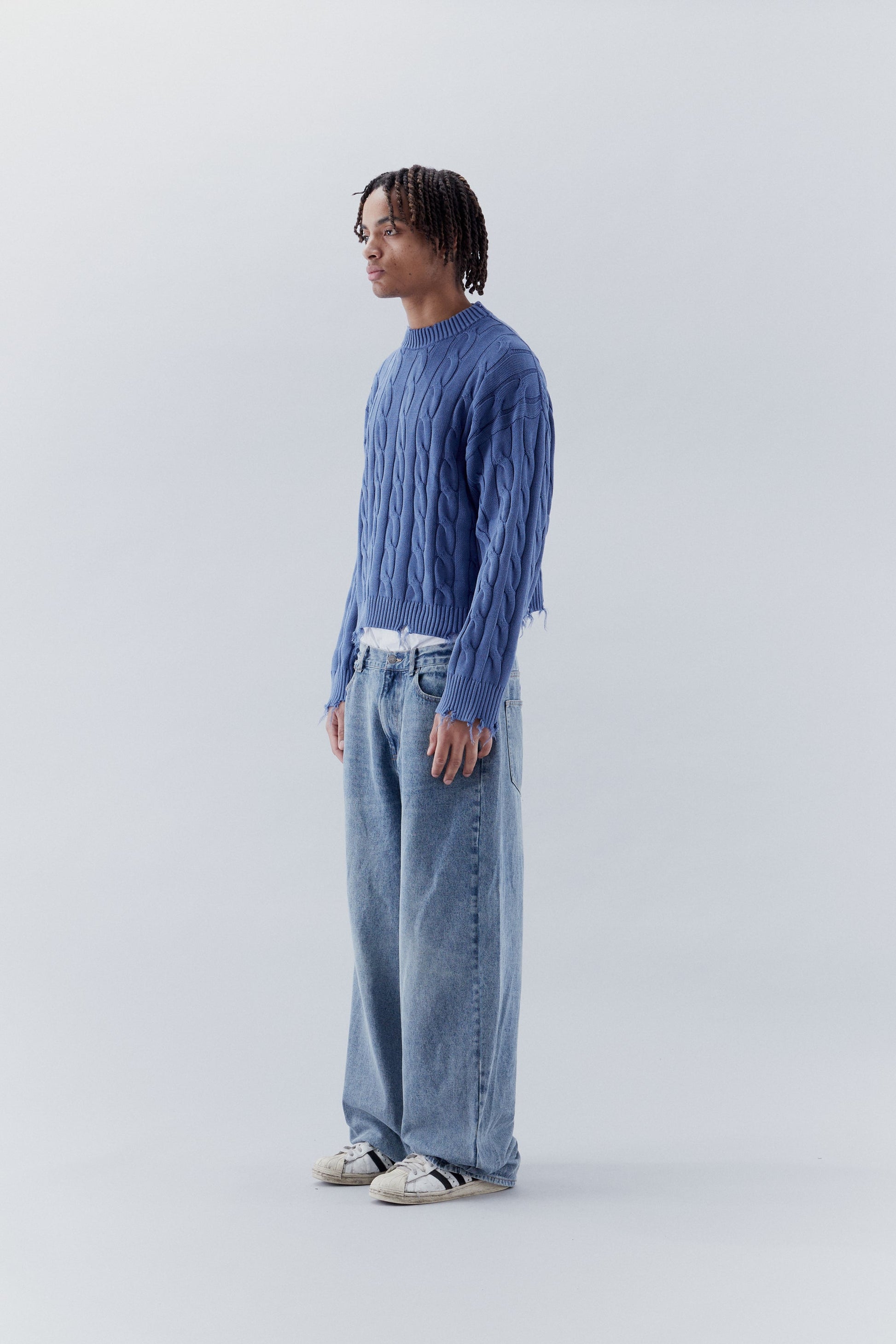 Luźny, niebieski sweter z warkoczowym splotem. Metka „Scuffers Studios” z tyłu. Przetarcia na rękawach, pasie i kołnierzu.