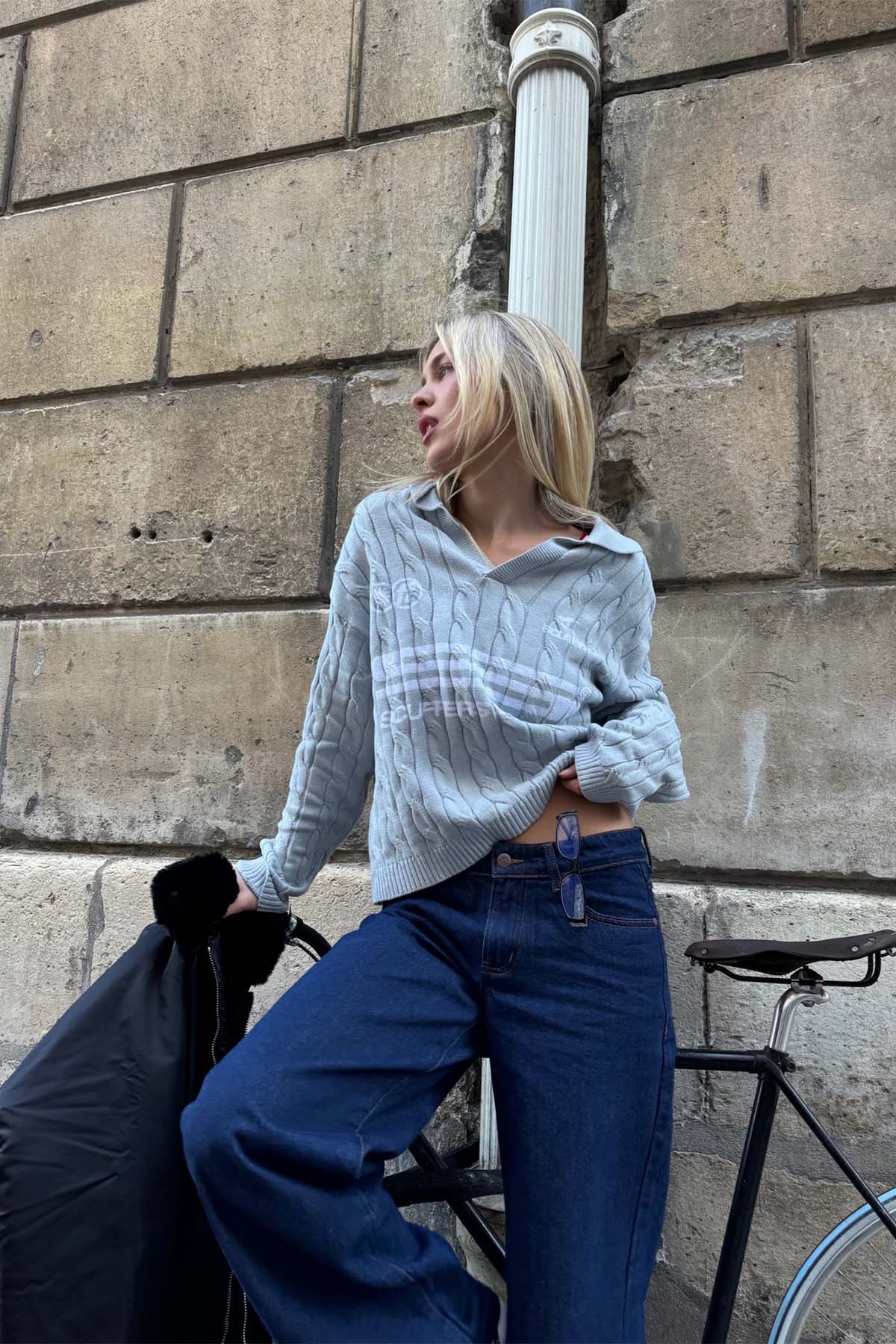 Jasnoniebieski sweter polo o kroju trencza, wykonany z miękkiej, oddychającej bawełny, zapewniającej wygodę. Charakteryzuje się teksturowanym splotem warkoczowym, kołnierzykiem z listwą w kształcie litery V oraz ściągaczami przy mankietach i u dołu. Kontrastują z nim wyraziste, białe, graficzne logo i napisy z przodu, łącząc klasyczną estetykę z nowoczesnym brandingiem. Idealny do noszenia warstwowego lub samodzielnie.