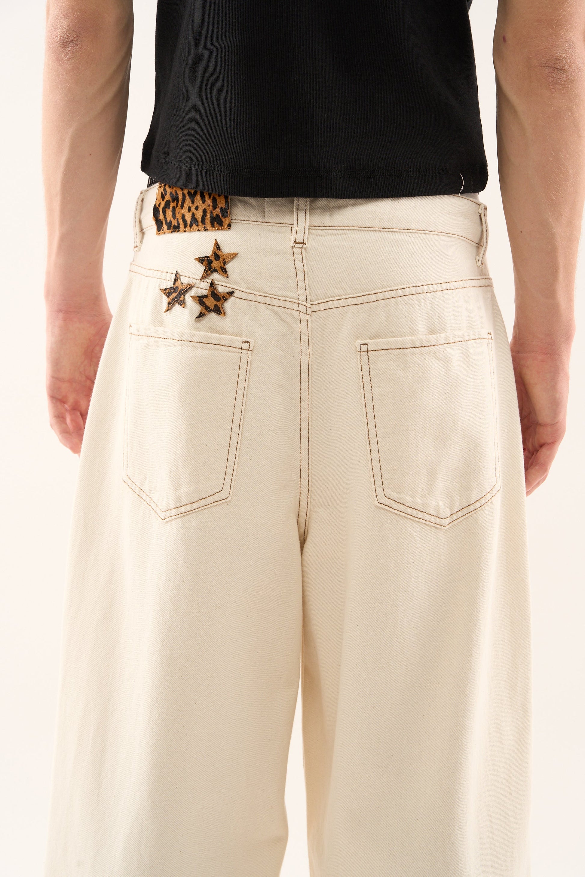 Luźne, luźne jeansy w kolorze ecru, ze standardowym paskiem i efektem przetarcia. Tradycyjne jeansy z pięcioma kieszeniami i naszymi gwiazdami „Worldwide” naszytymi w górnej części pleców po lewej stronie w panterkę.