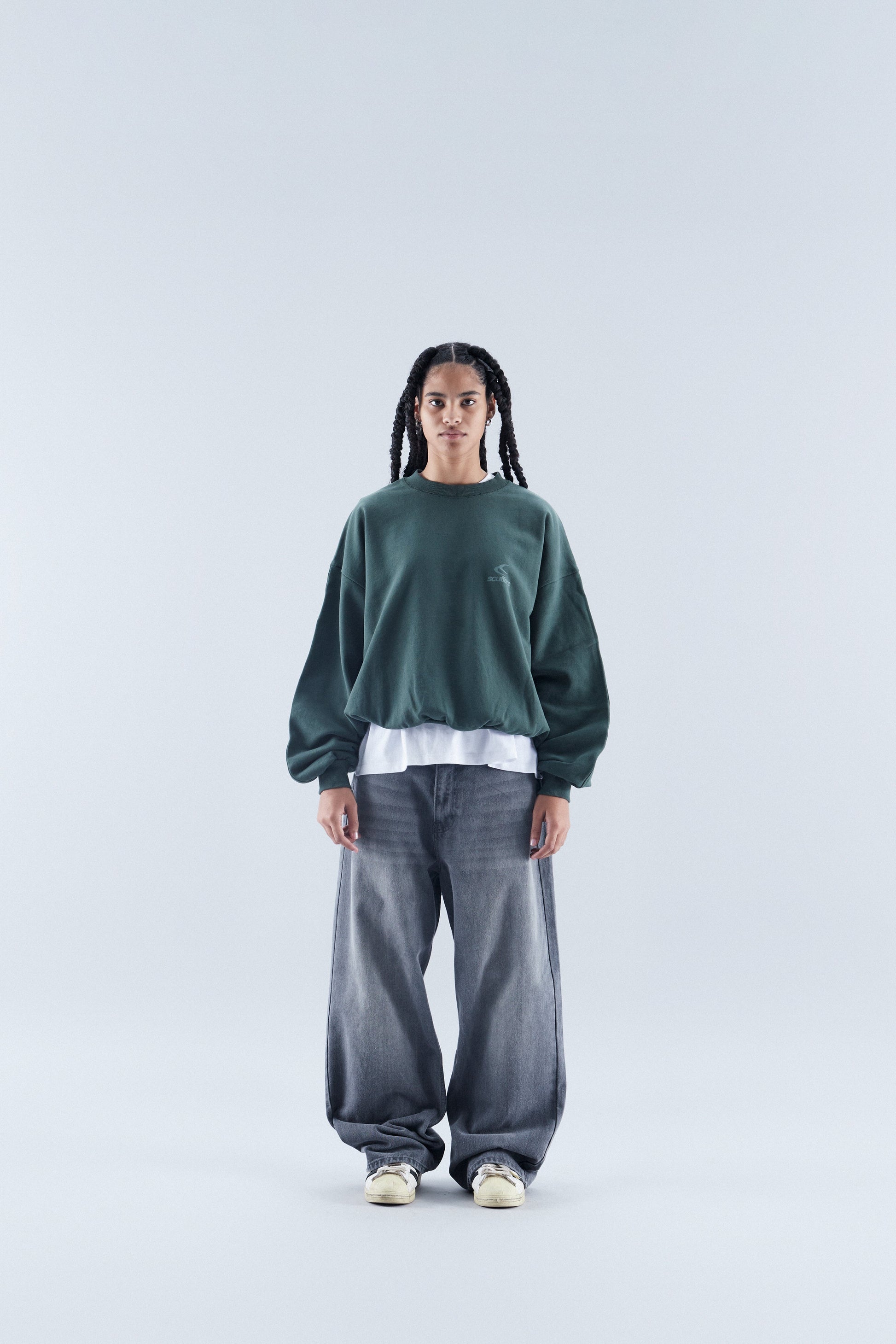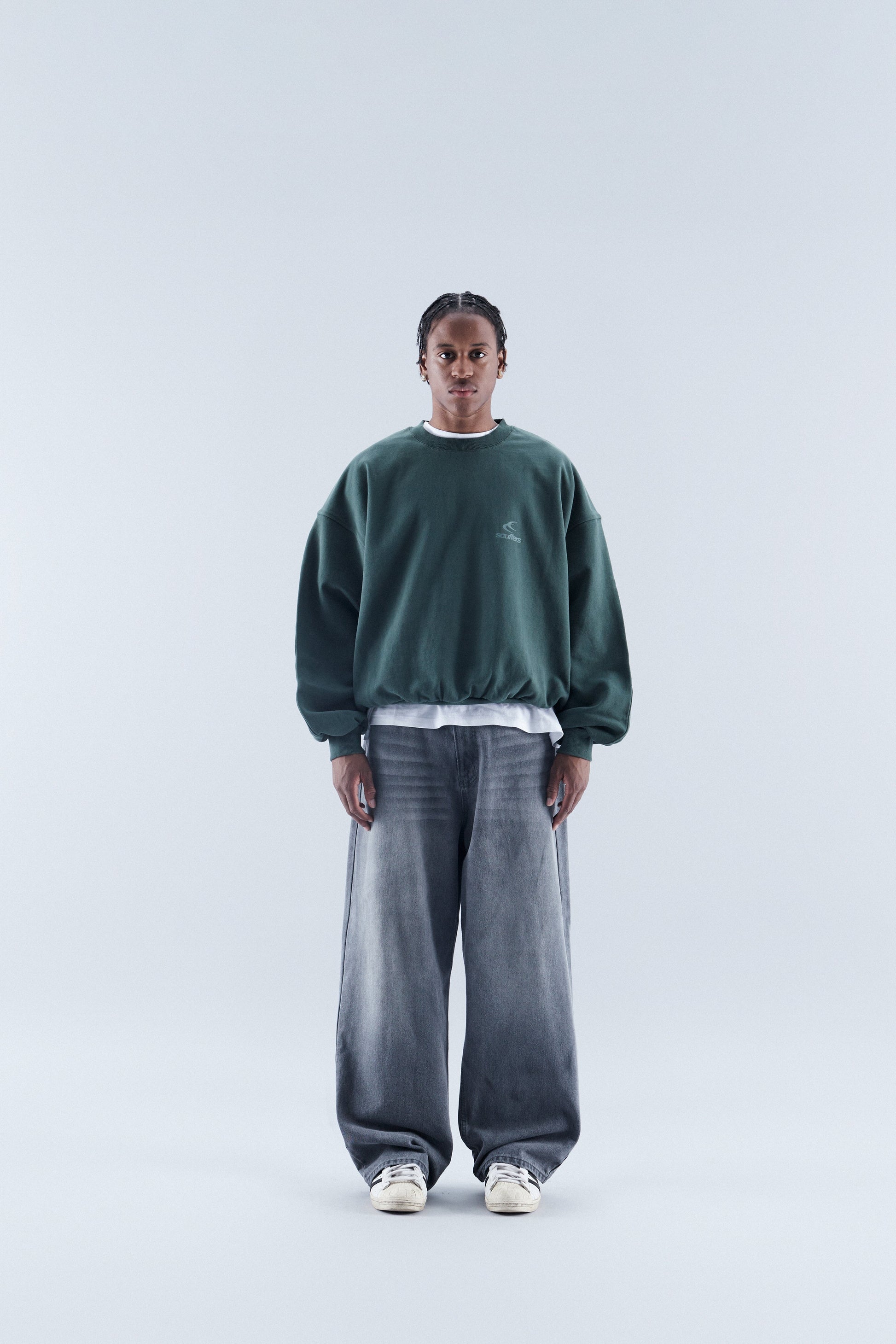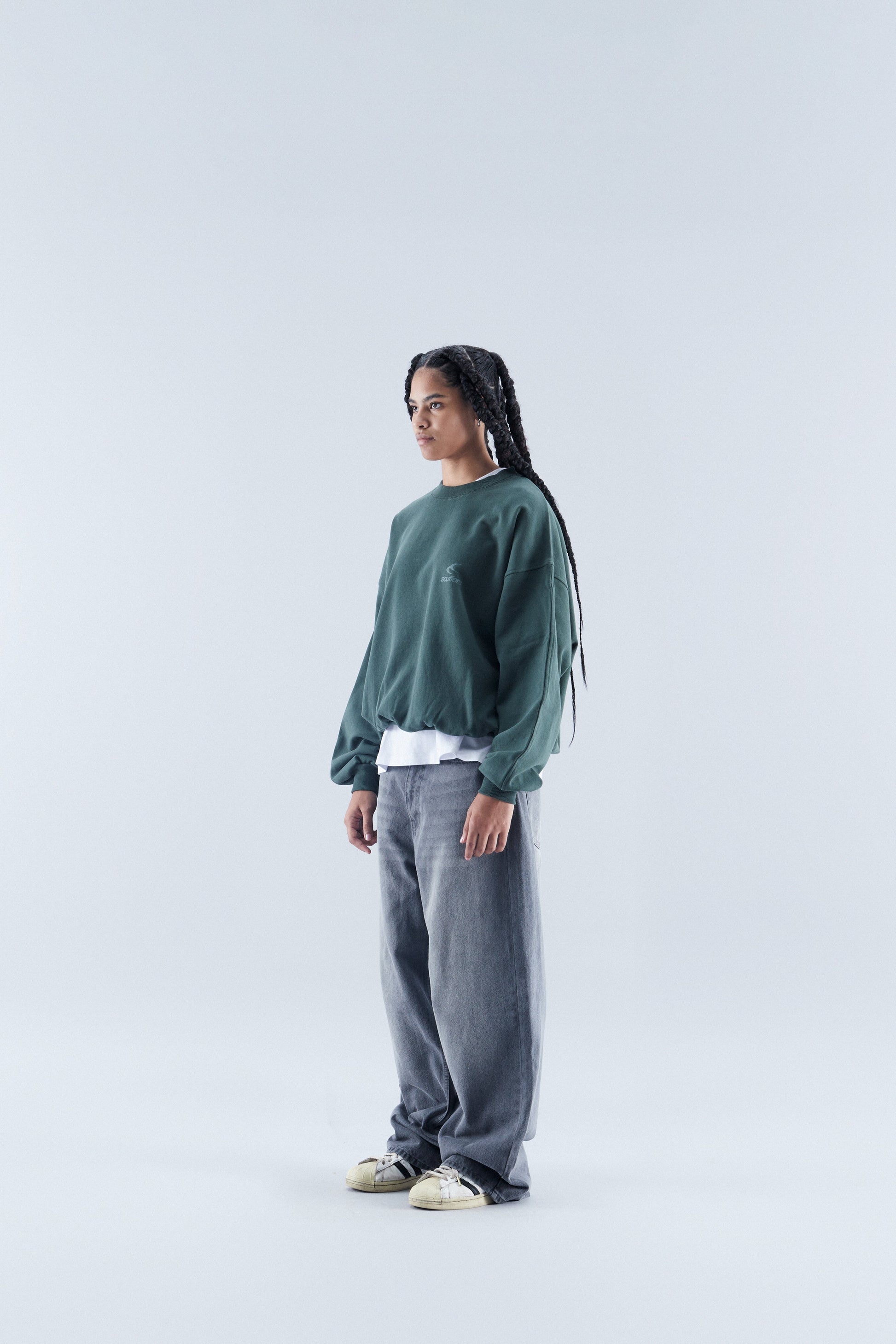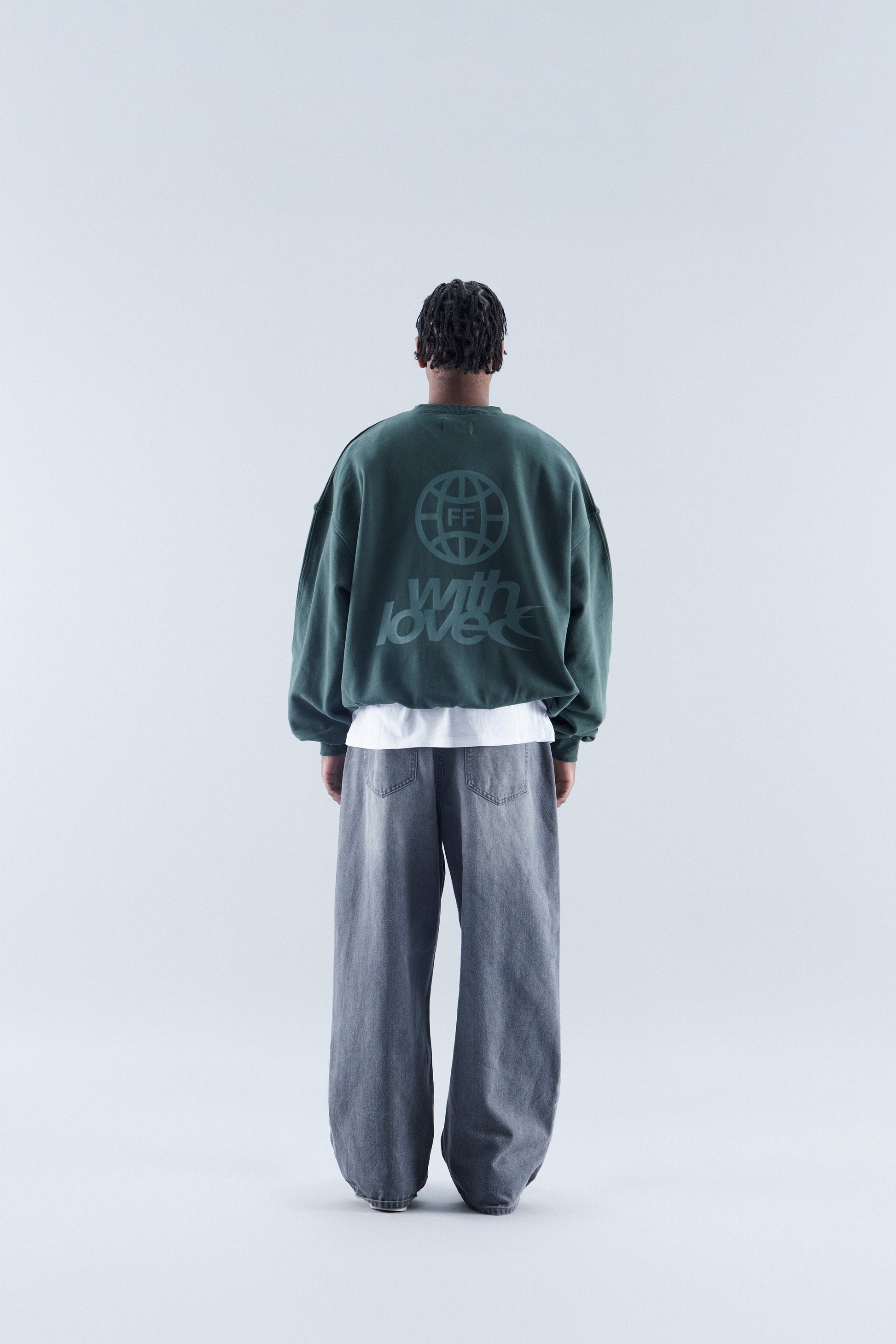 Oversize'owy, okrągły dekolt z grubym, kwadratowym krojem w kolorze ciemnozielonym. Sitodruk po obu stronach, z przodu i z tyłu. Z przodu logo „Scuffers”, a z tyłu wzór „With love”, oba w kolorze jasnozielonym.