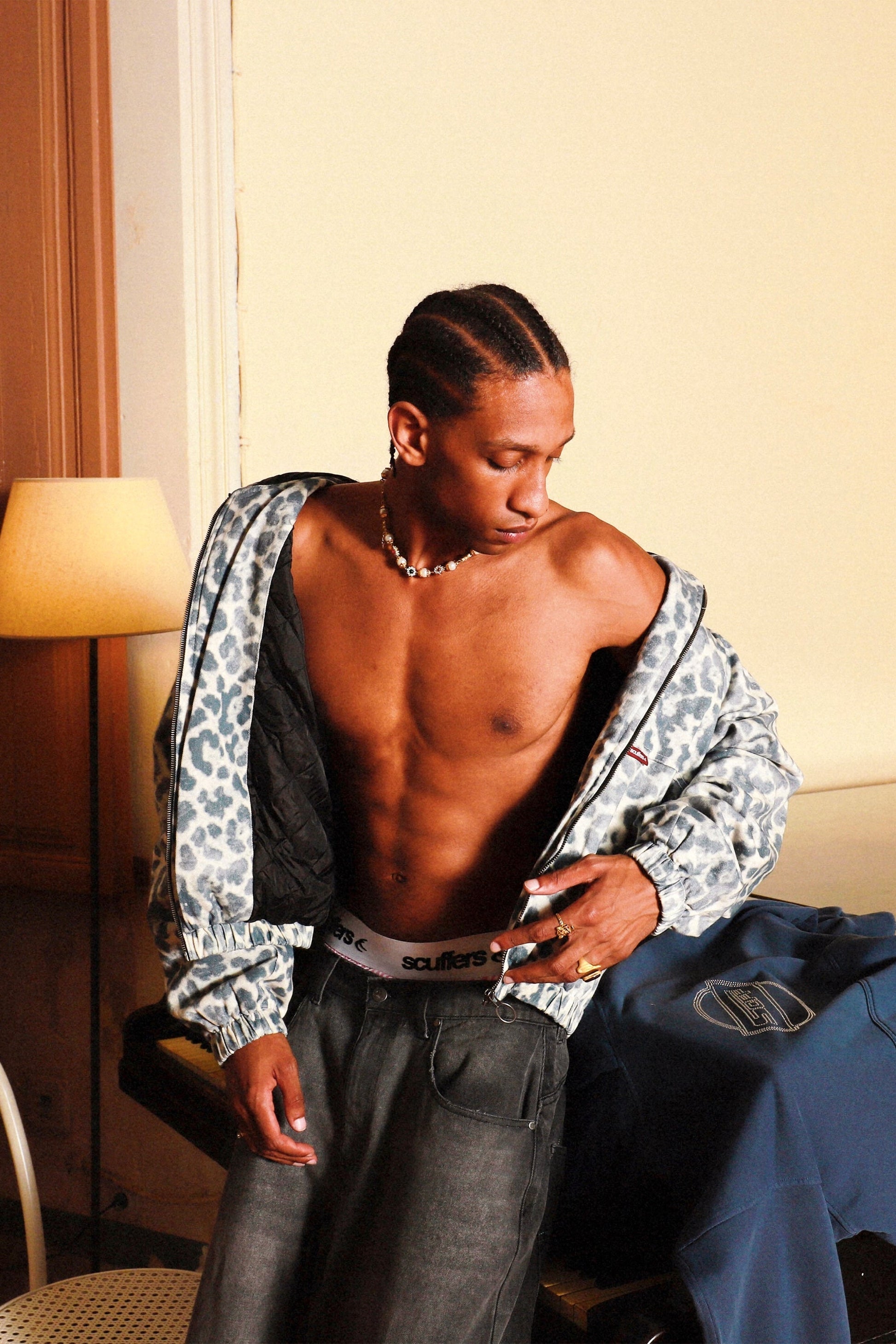 Kurtka robocza ma wzór w panterkę w odcieniach niebieskiego i bieli. Zapinana jest na suwak z przodu z metalowym uchwytem oraz posiada dwie duże kieszenie z przodu. Elastyczne mankiety i dół kurtki zapewniają idealne dopasowanie, a wnętrze jest wyściełane czarną podszewką, która zapewnia dodatkowe ciepło. Na jednej z przednich kieszeni naszyta jest mała, czerwona metka z logo „Scuffers”.